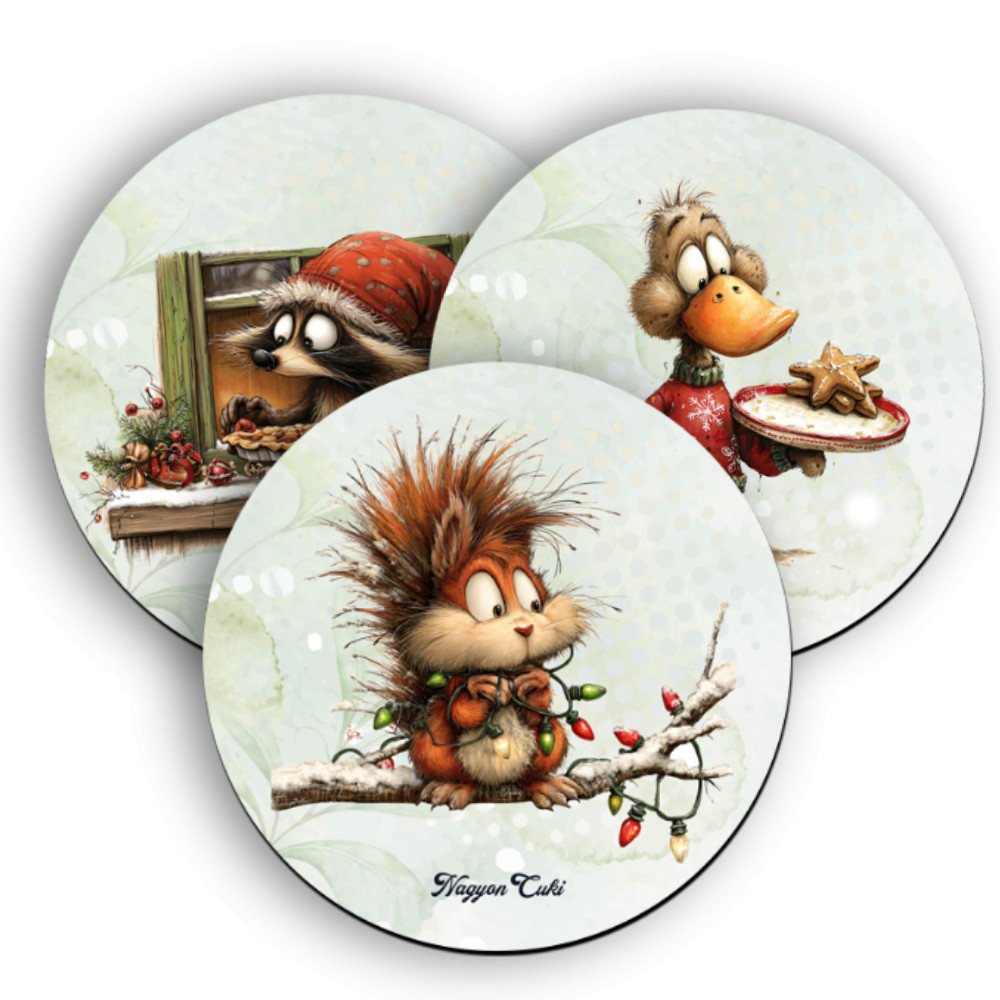 3 db aranyos karácsonyi erdei varázs Kör Alakú Poháralátét Szett | Egyedi Ajándék & Téli otthon dekor | nagyoncuki.hu