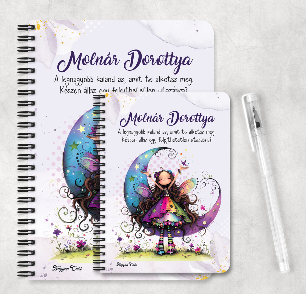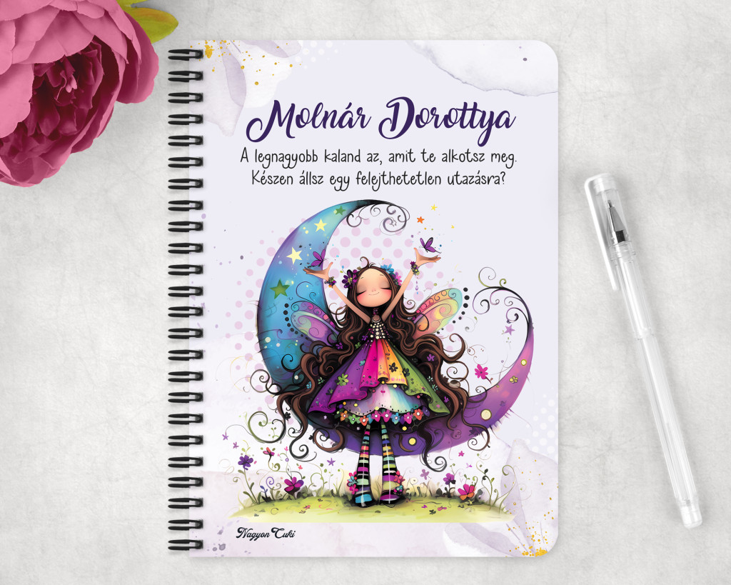 Ezt a személyre szabható Furi tavaszi tündér füzetet azért hoztuk létre mi, a nagyoncuki.hu csapata, hogy egy biztonságos, ítélkezésmentes helyet adjunk a gondolataidnak. Amikor ezt a füzetet adod ajándékba, valójában egy gyönyörű, érzelmi üzenetet közvetítesz. Az ajándék a szeretetünk és a támogatásunk látható hordozója, ez a szélkócos kis tündér pedig minden lapozásnál azt suttogja: "Higgy magadban! Írj, rajzolj, tervezz, hibázz és kezdd újra – mert a te történeted úgy csodálatos, ahogy van!"