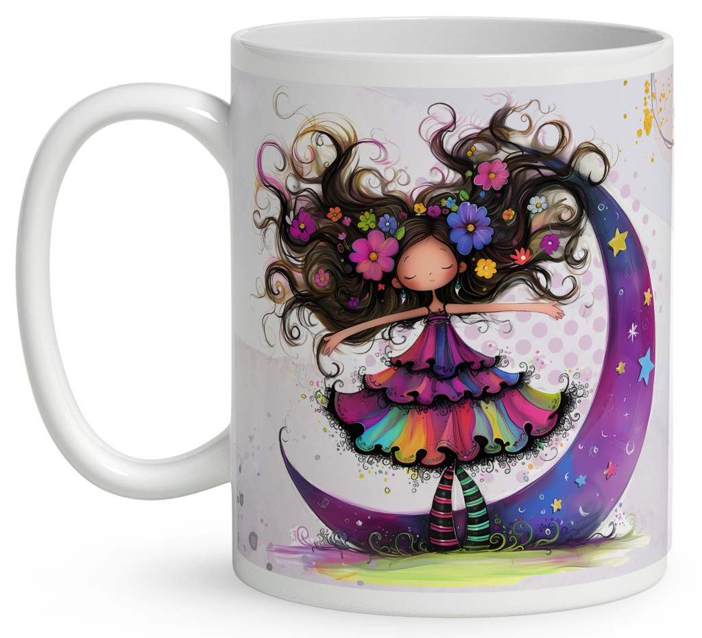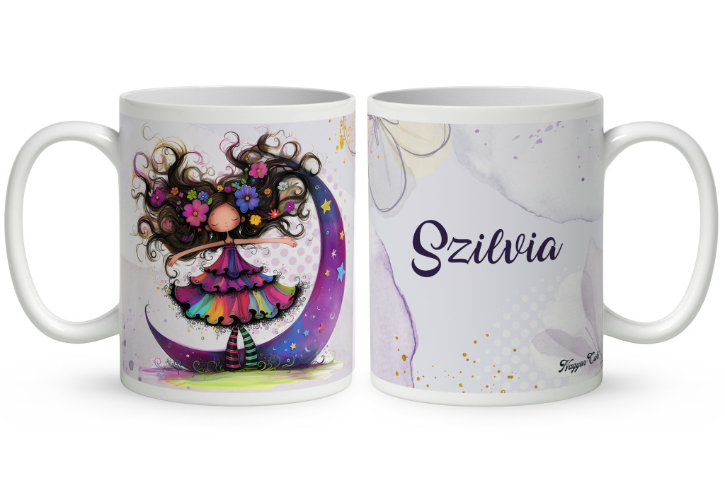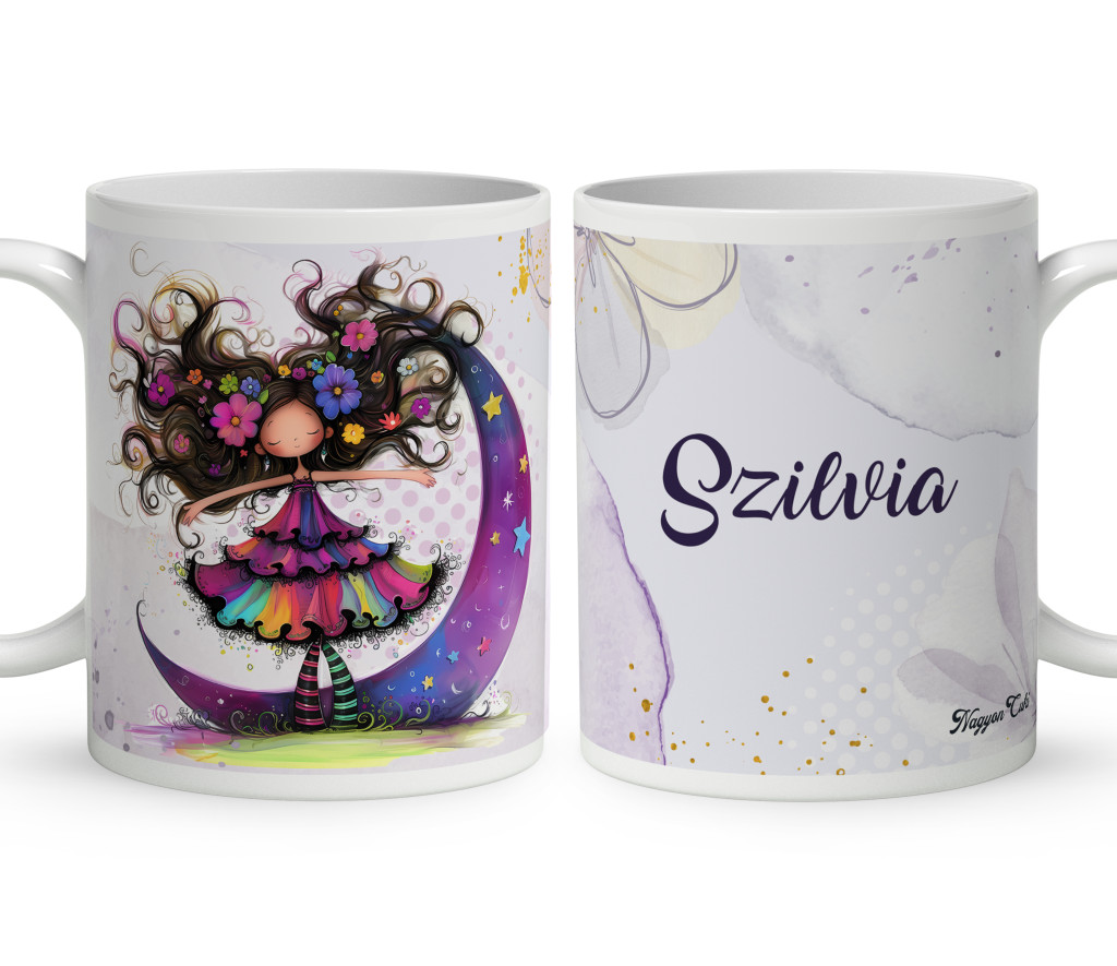 Névvel kérhető - Bájos lila virágos tündér és a hold mintás Bögre | Egyedi Ajándék Lányoknak és Nőknek | nagyoncuki.hu