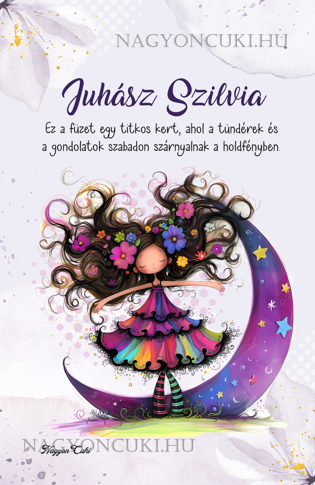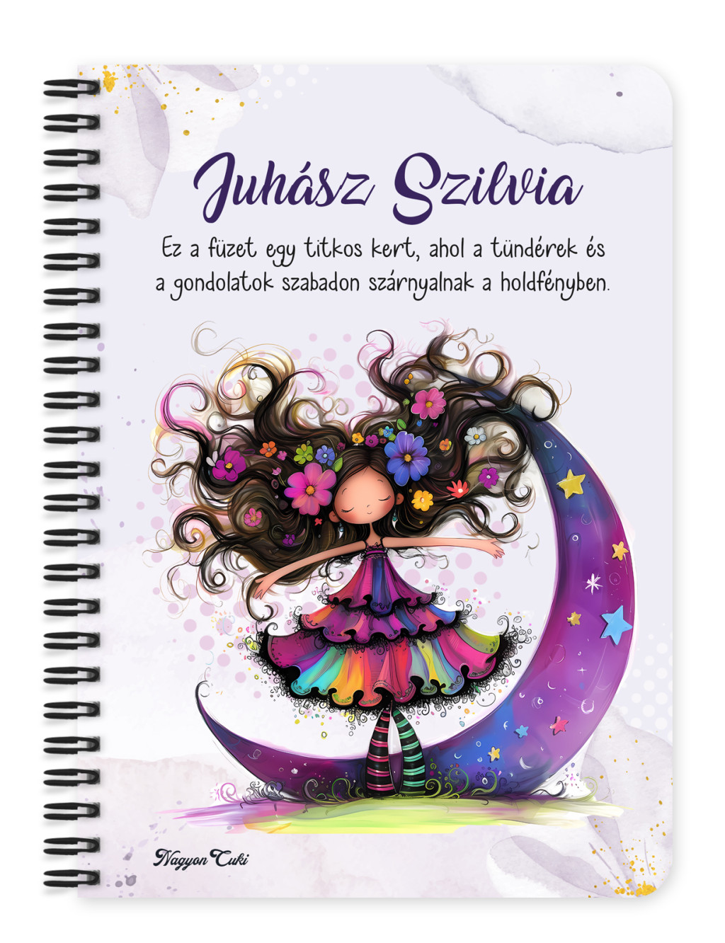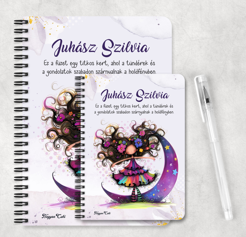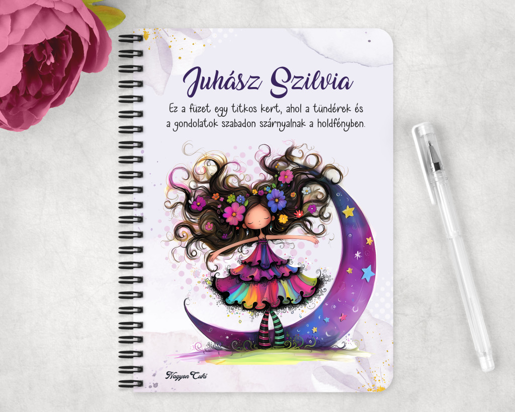 Személyre szabható - Bájos lila virágos tündér és a hold mintás Füzet | Egyedi Ajándék & Személyes Napló | nagyoncuki.hu