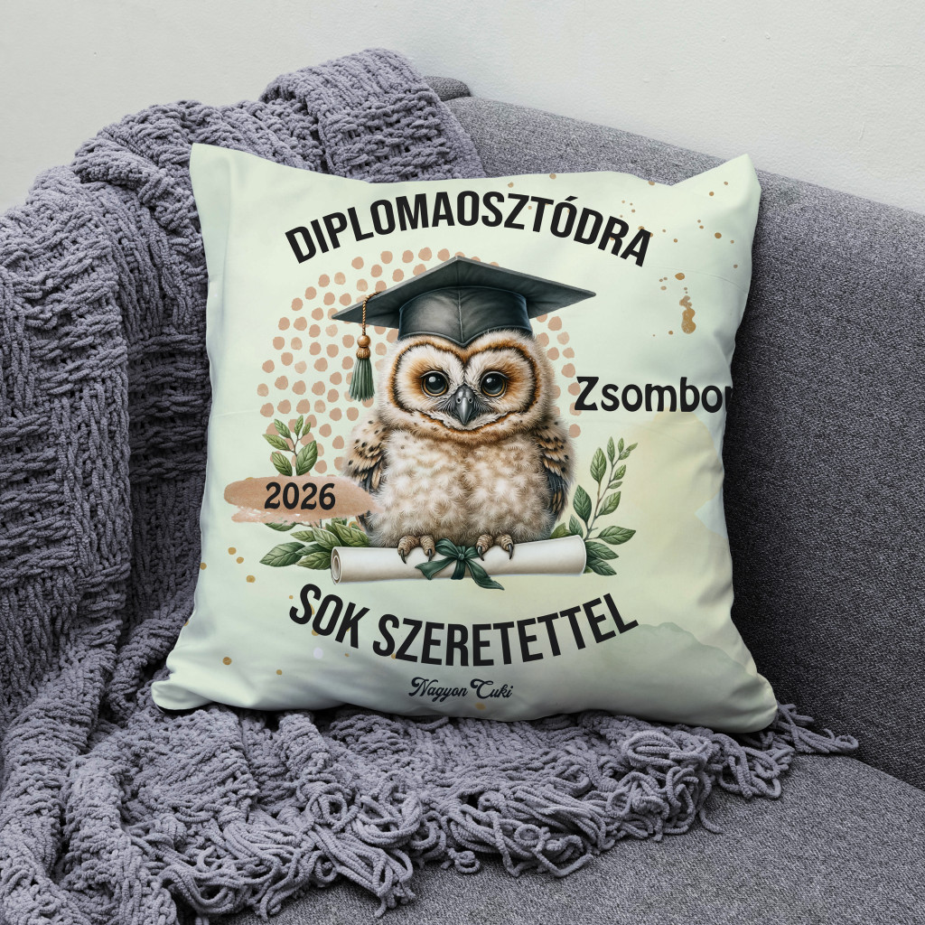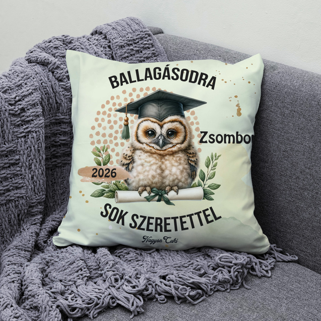 Tökéletes ballagási ajándék ötletet keresel? Névre szóló baglyos párna 2026-os Ballagásra és Diplomaosztóra – Az elért sikerek legpuhább őrzője