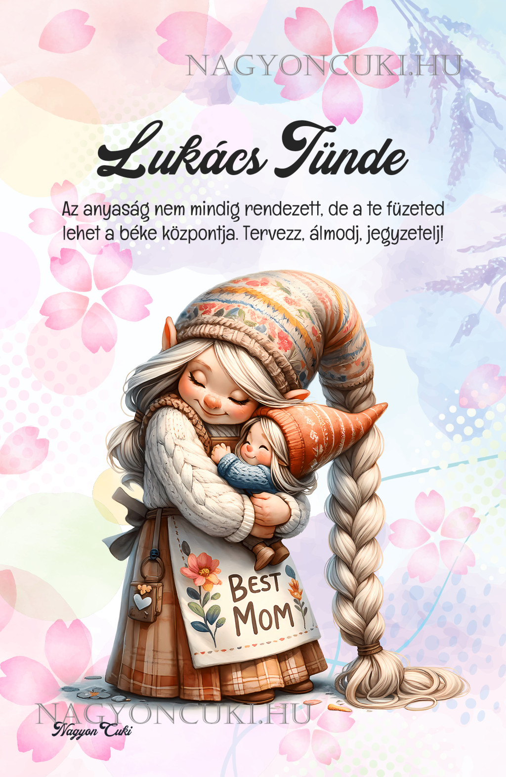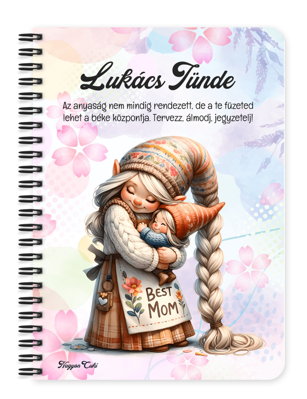 Ezt az üzenetet zártuk ebbe a Cuki Anya Manó füzetbe. Ez a füzet nem csupán egy jegyzetfüzet. Ez egy főhajtás Anya előtt. Amikor kézbe veszi ezt a bájos, névre szóló füzetet, a rajta lévő gondoskodó Anya Manó emlékeztetni fogja: "Látjuk, mennyi mindent teszel értünk. Értékeljük a szeretetedet. Ez most a Te helyed, a Te gondolataidnak."