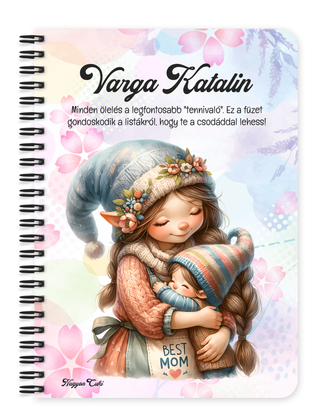 Ezt az üzenetet zártuk ebbe a Cuki Anya Manó füzetbe. Ez a füzet nem csupán egy jegyzetfüzet. Ez egy főhajtás Anya előtt. Amikor kézbe veszi ezt a bájos, névre szóló füzetet, a rajta lévő gondoskodó Anya Manó emlékeztetni fogja: "Látjuk, mennyi mindent teszel értünk. Értékeljük a szeretetedet. Ez most a Te helyed, a Te gondolataidnak."