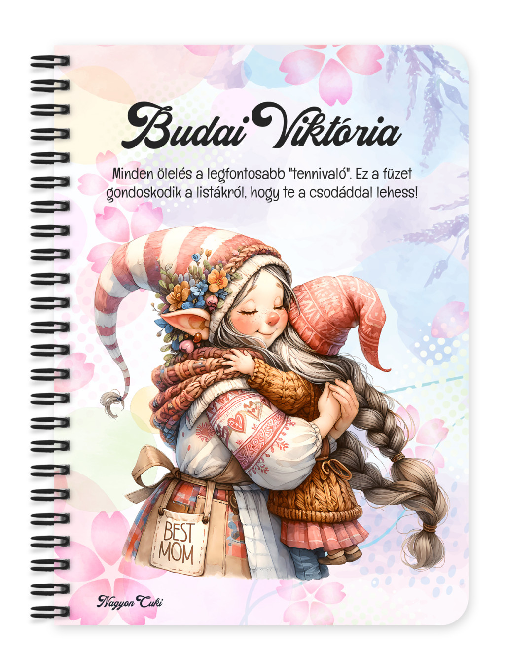 Ezt az üzenetet zártuk ebbe a Cuki Anya Manó füzetbe. Ez a füzet nem csupán egy jegyzetfüzet. Ez egy főhajtás Anya előtt. Amikor kézbe veszi ezt a bájos, névre szóló füzetet, a rajta lévő gondoskodó Anya Manó emlékeztetni fogja: "Látjuk, mennyi mindent teszel értünk. Értékeljük a szeretetedet. Ez most a Te helyed, a Te gondolataidnak."