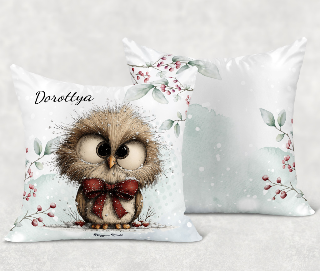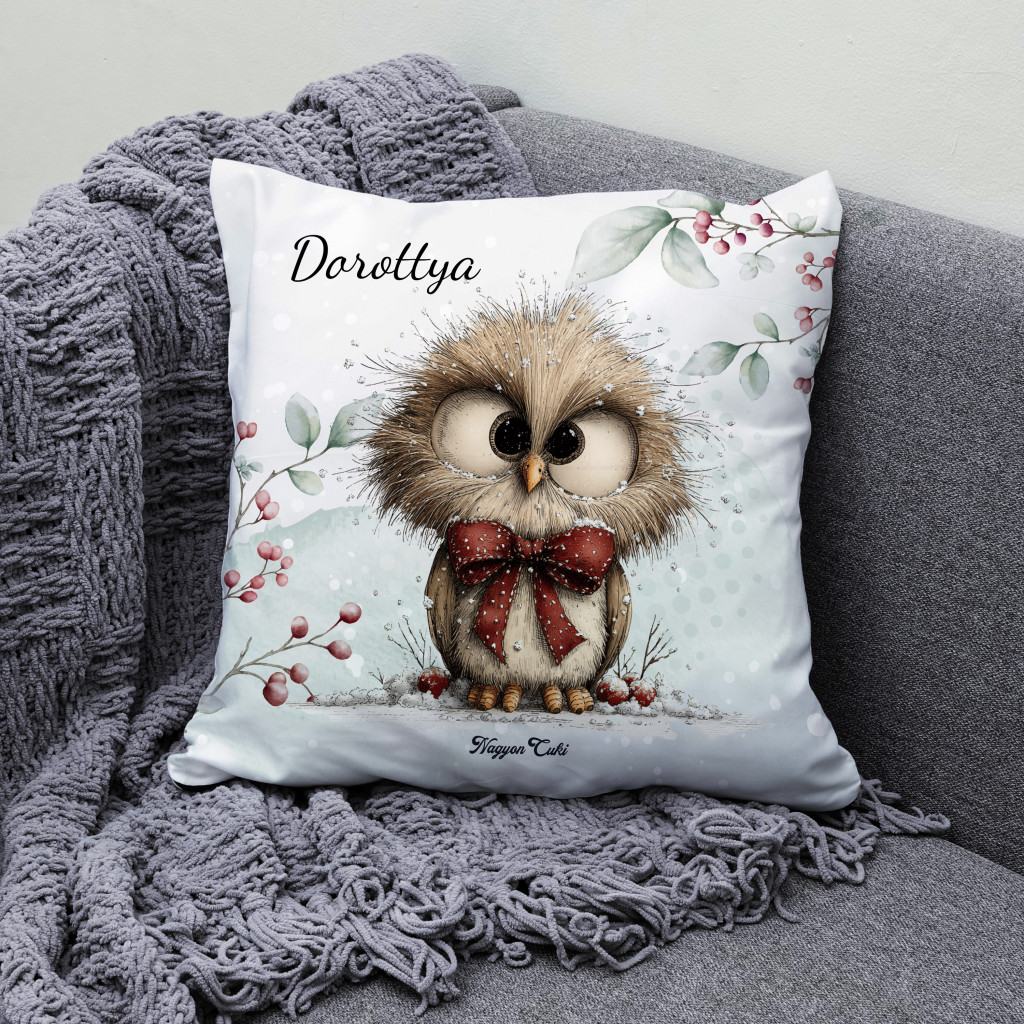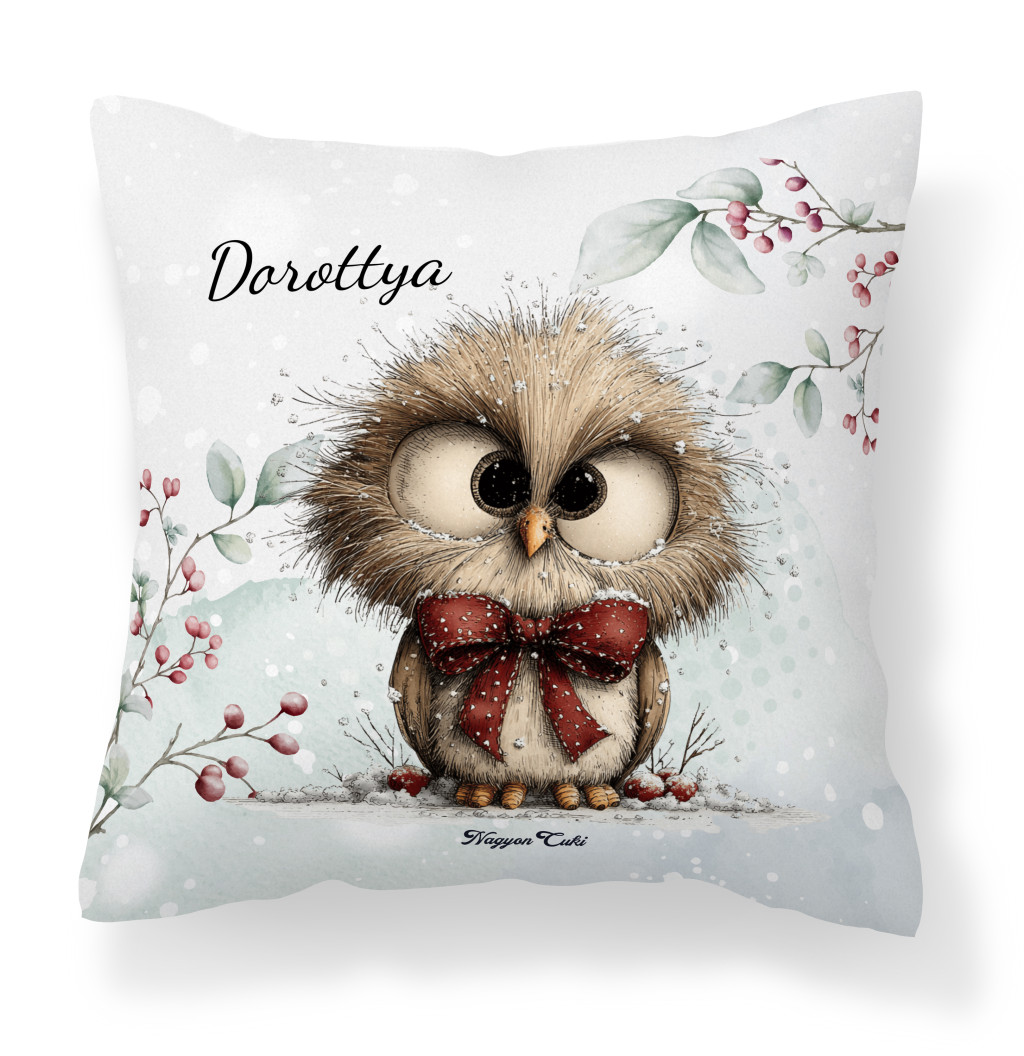 Névvel kérhető - Cuki karácsonyi bagoly nagy masnival mintás különleges és egyedi párna | Névre Szóló Karácsonyi Ajándék & Téli otthon dekor | nagyoncuki.hu