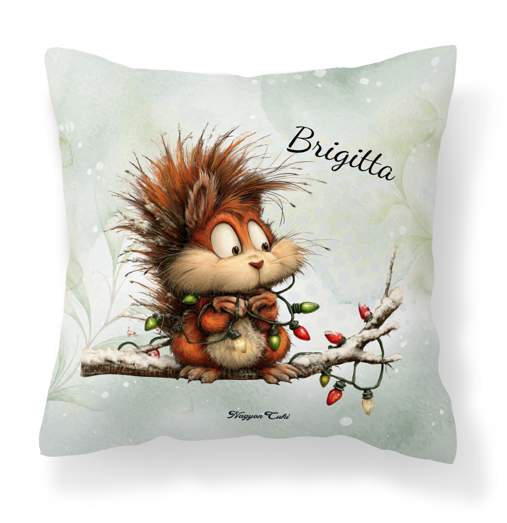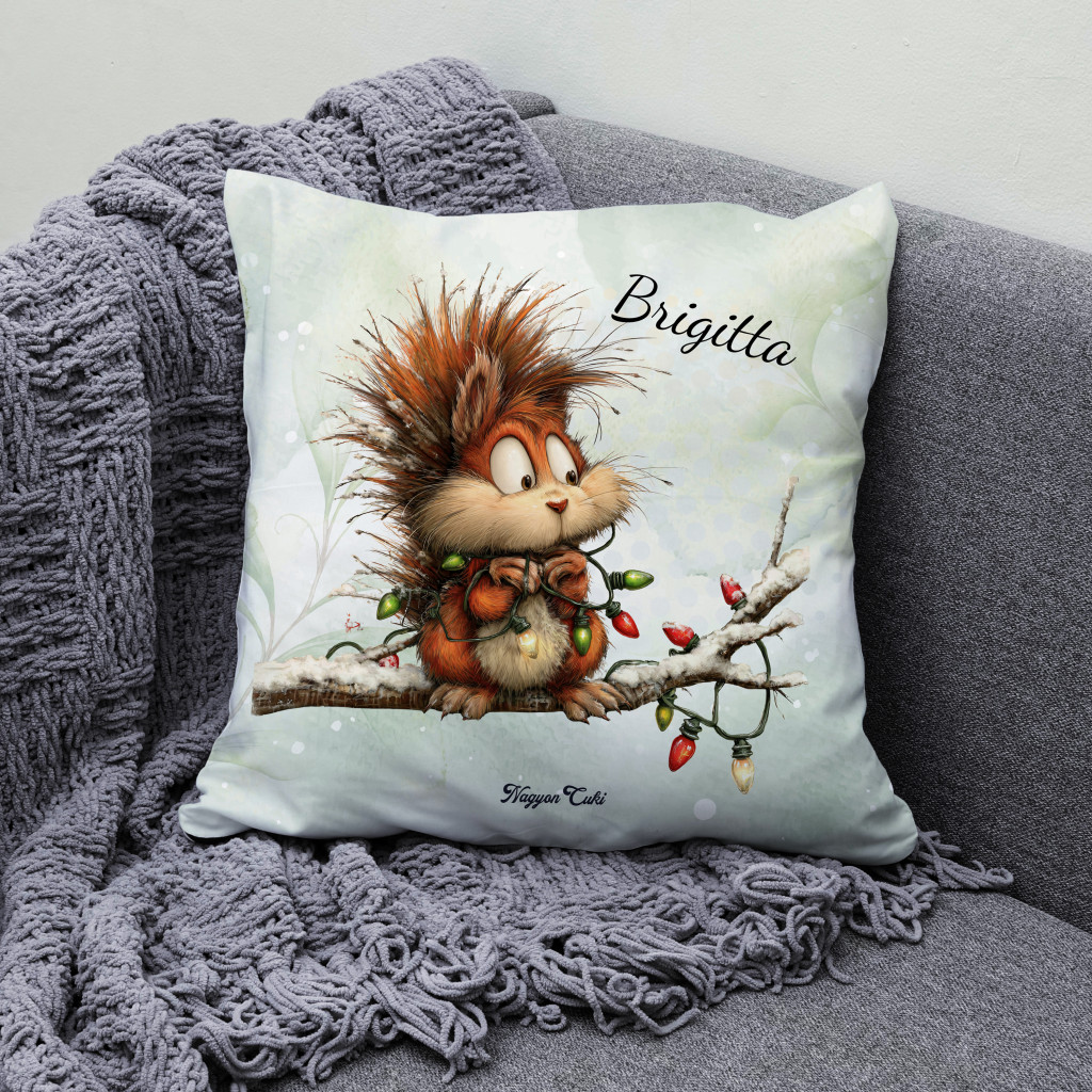 Névvel kérhető - Cuki karácsonyi mókus és az égősor mintás különleges és egyedi párna | Névre Szóló Karácsonyi Ajándék & Téli otthon dekor | nagyoncuki.hu