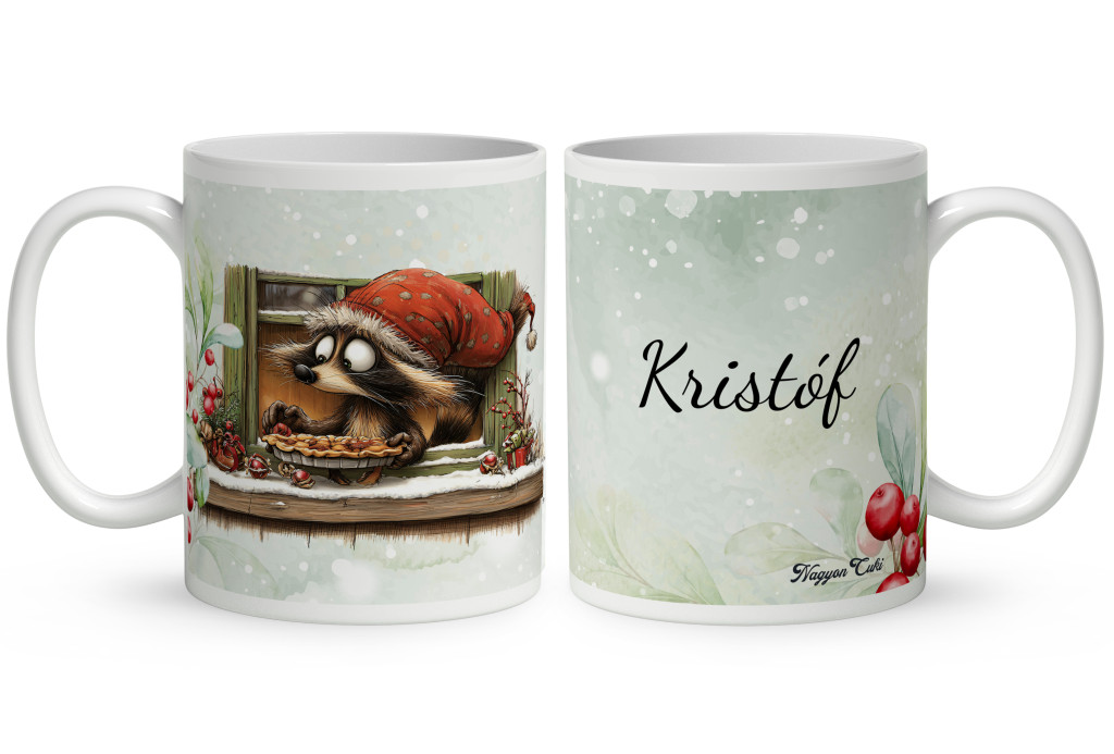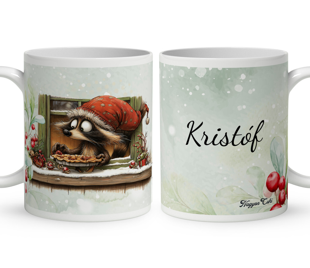 Miért válaszd ezt a névre szóló cuki karácsonyi mosómedve mintás bögrét?