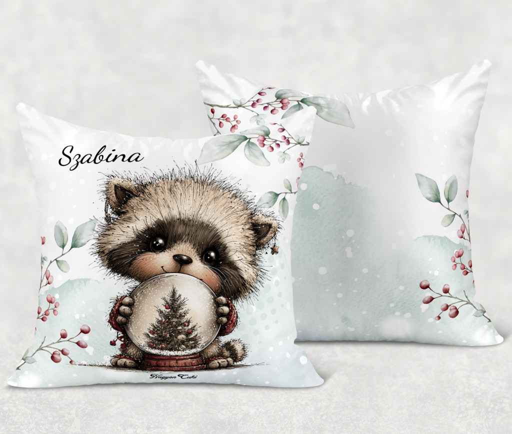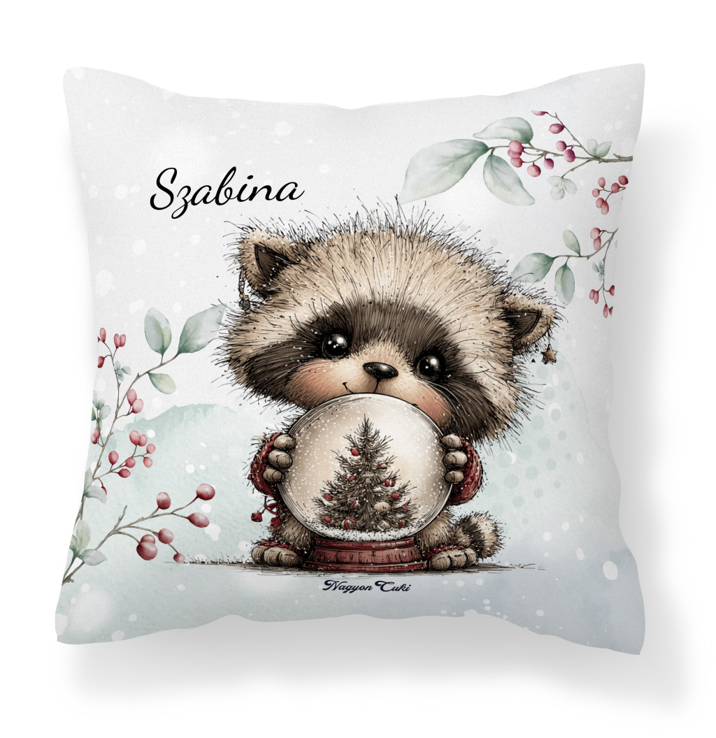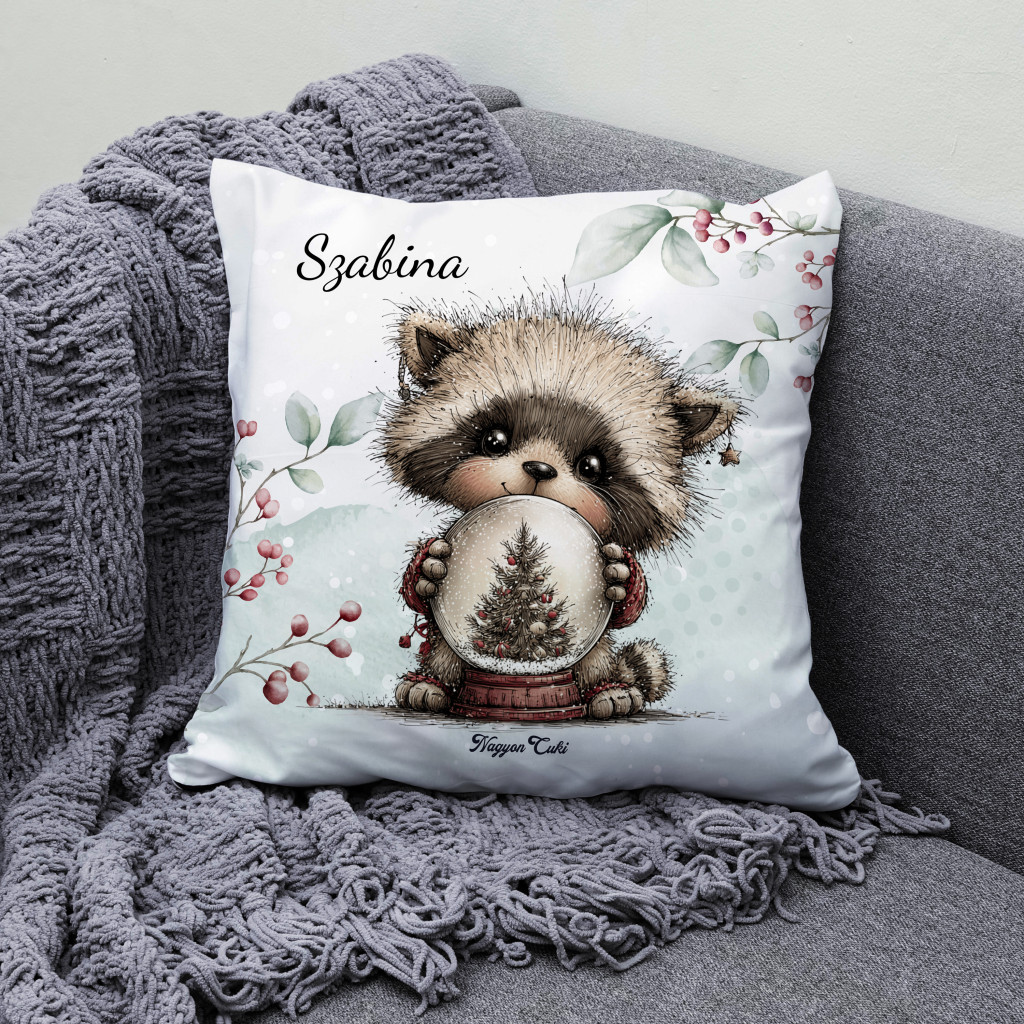 Névvel kérhető - Cuki karácsonyi mosómaci hógömbbel mintás különleges és egyedi párna | Névre Szóló Karácsonyi Ajándék & Téli otthon dekor | nagyoncuki.hu