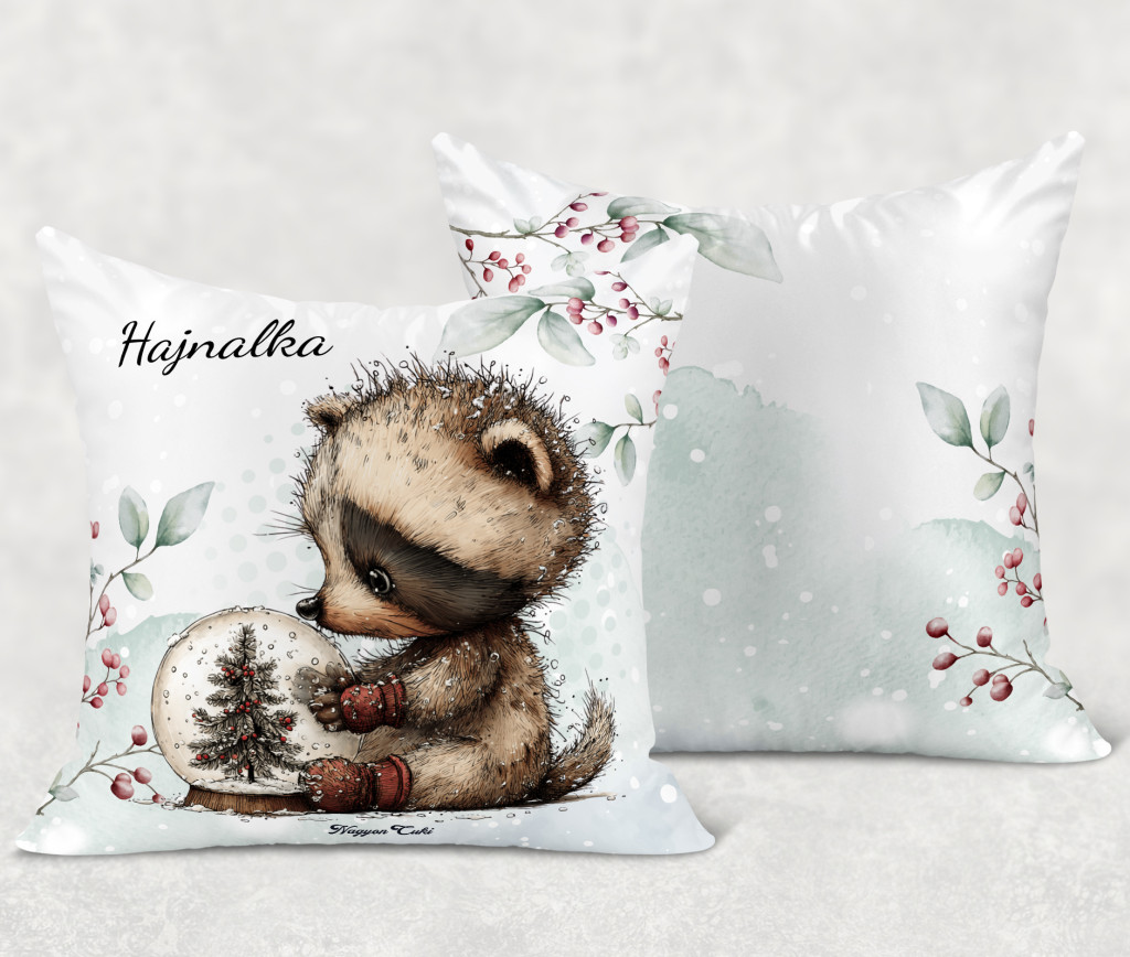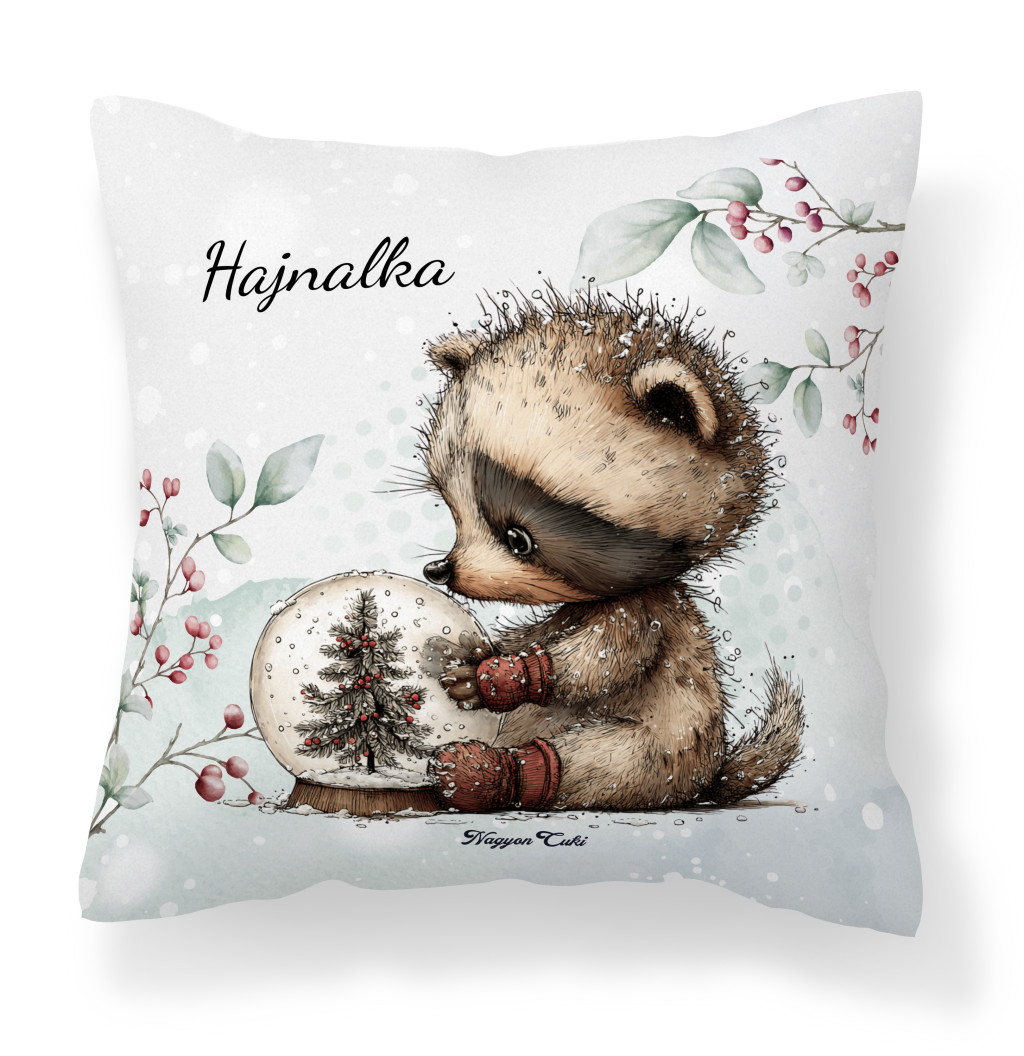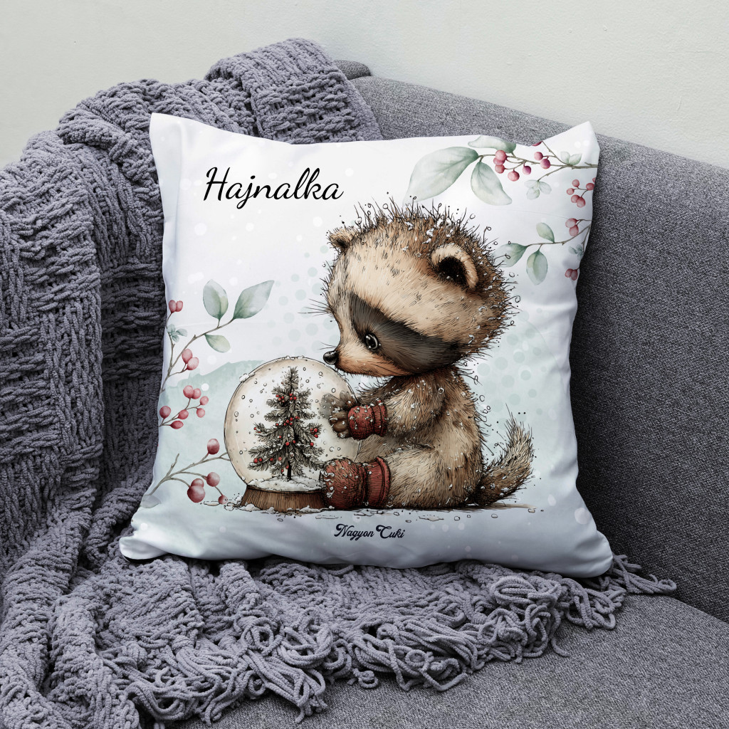 Névvel kérhető - Cuki karácsonyi mosómedve hógömbbel mintás különleges és egyedi párna | Névre Szóló Karácsonyi Ajándék & Téli otthon dekor | nagyoncuki.hu