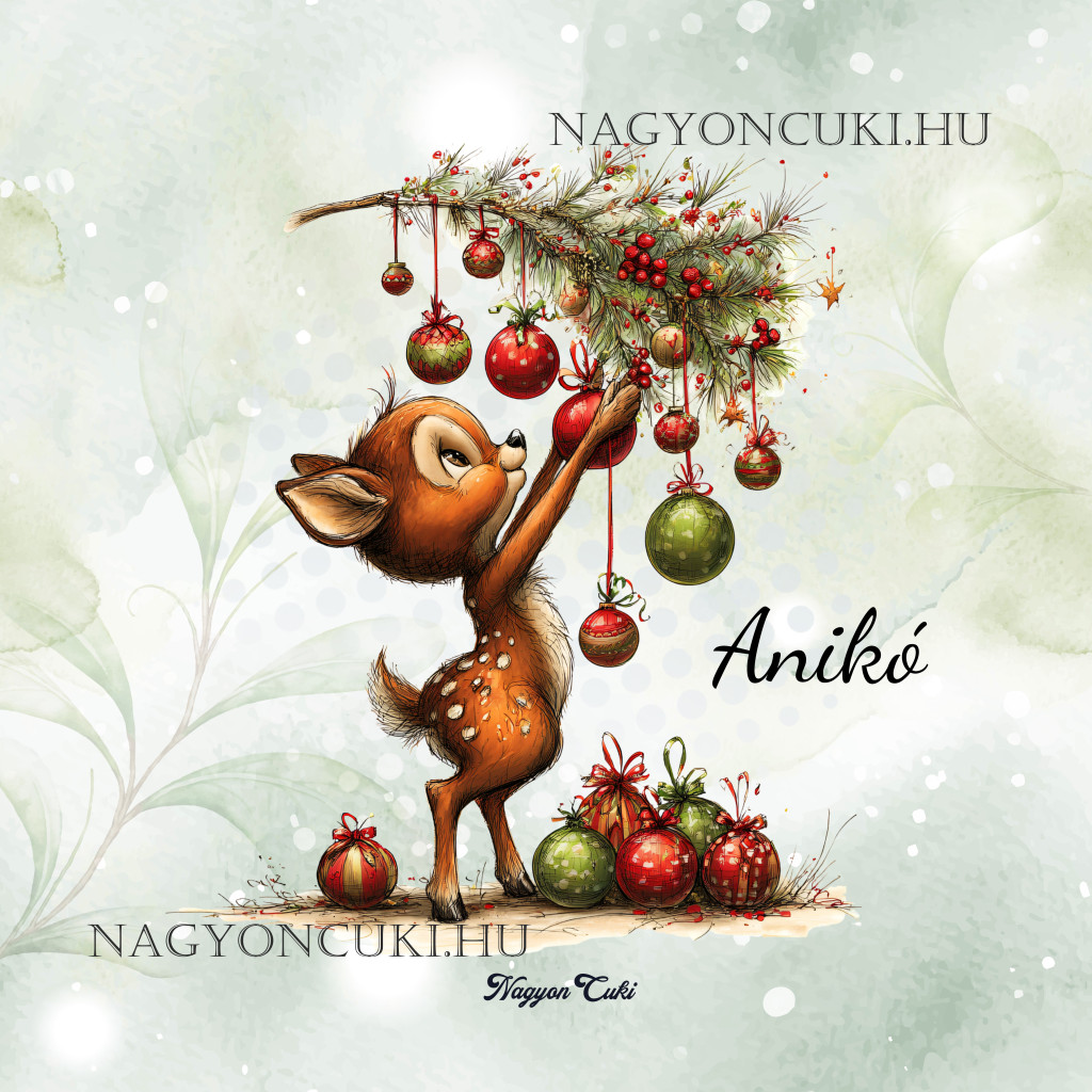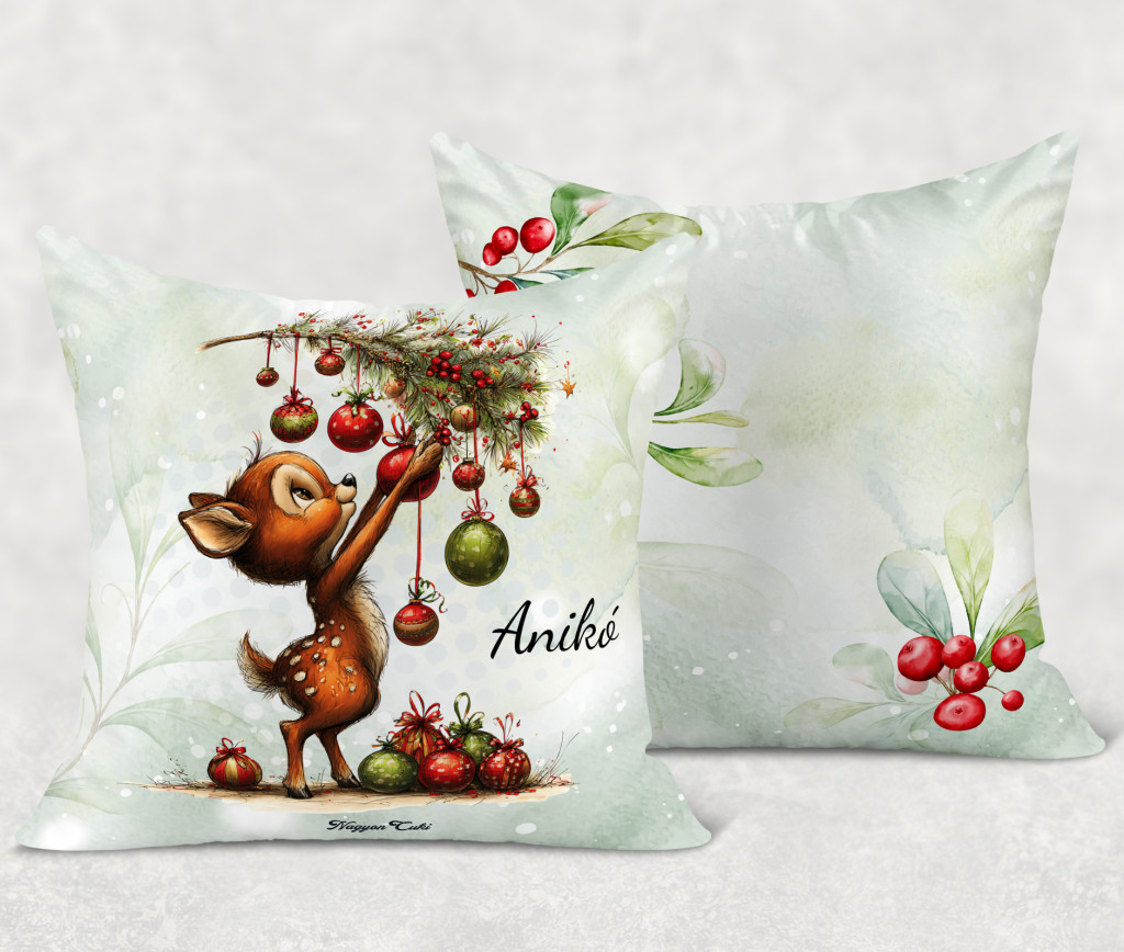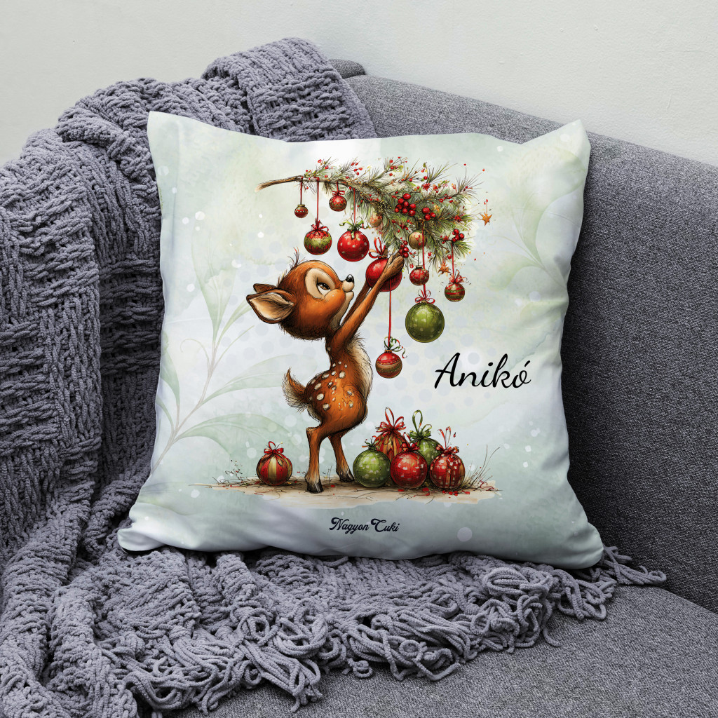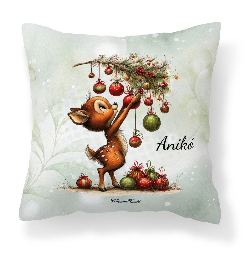 Névvel kérhető - Cuki karácsonyi őzike és a díszek mintás különleges és egyedi párna | Névre Szóló Karácsonyi Ajándék & Téli otthon dekor | nagyoncuki.hu