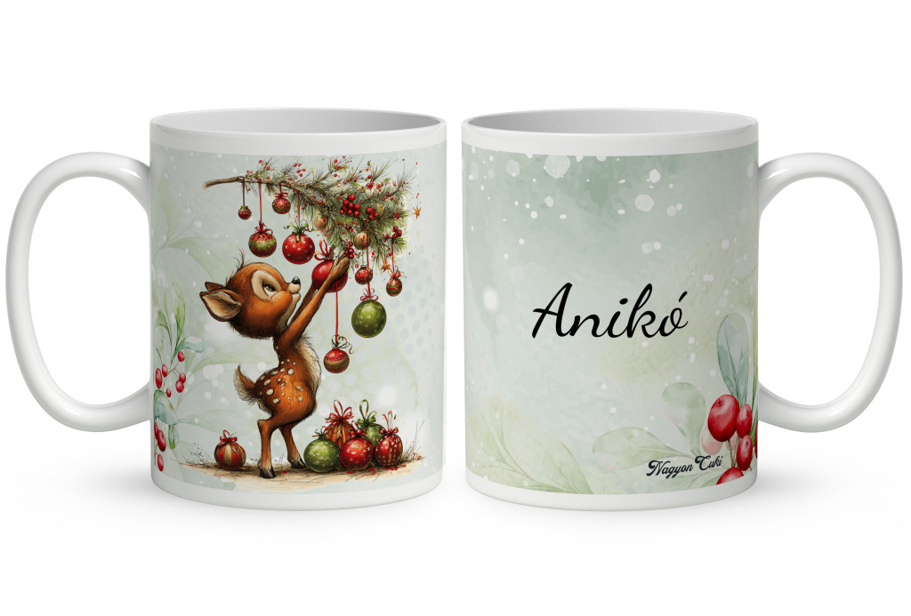 Névvel kérhető - Cuki karácsonyi őzike és a díszek mintás Bögre | Névre Szóló Karácsonyi Ajándék | nagyoncuki.hu