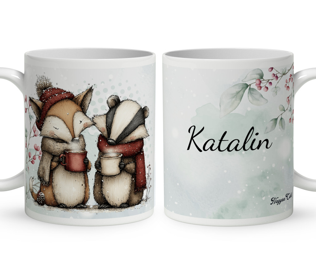 Névvel kérhető - Cuki karácsonyi róka és a borz kávéval mintás Bögre | Névre Szóló Karácsonyi Ajándék | nagyoncuki.hu