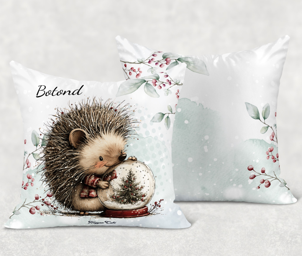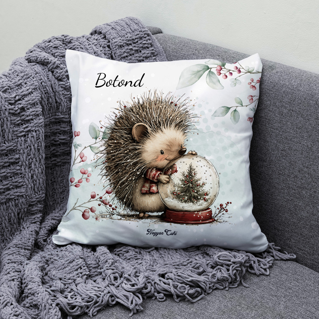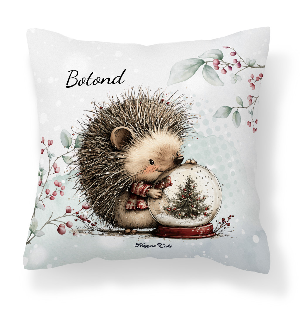 Névvel kérhető - Cuki karácsonyi süni és a hógömb kávéval mintás különleges és egyedi párna | Névre Szóló Karácsonyi Ajándék & Téli otthon dekor | nagyoncuki.hu