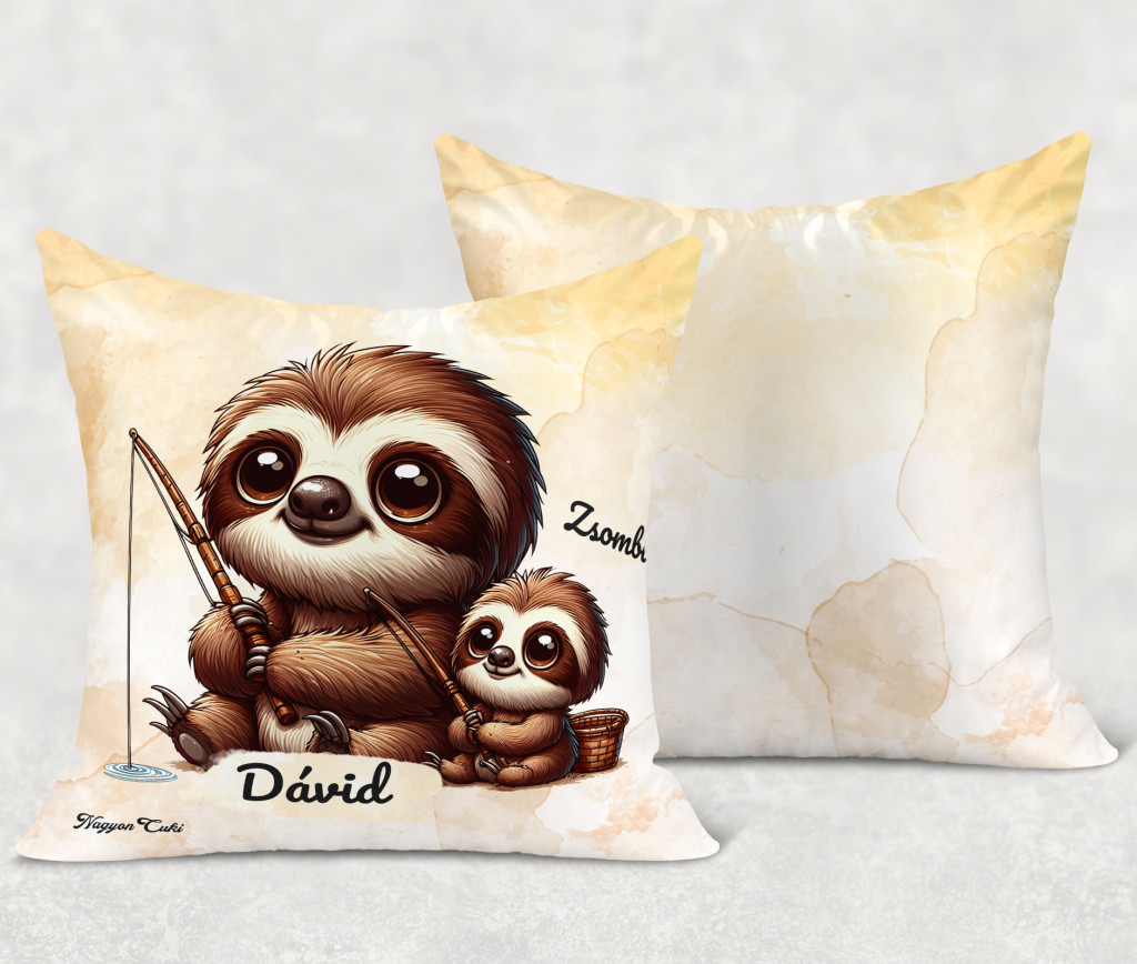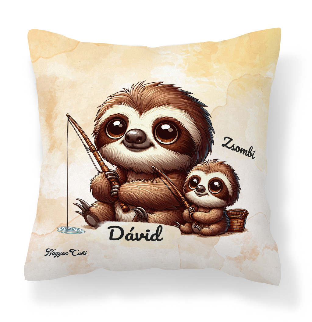 Névvel kérhető - Cuki lajhár Apa és gyermeke horgásznak Párna | A Gondoskodás és Pihenés Ajándéka | nagyoncuki.hu