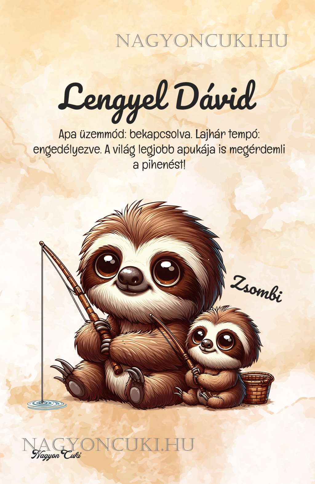 A grafikán a büszke apa lajhár látható az ölelő kicsikkel. A személyre szabható idézet (pl. "A világ legjobb Apukájának" vagy "Te vagy a mi hősünk") pedig megkoronázza az ajándékot.