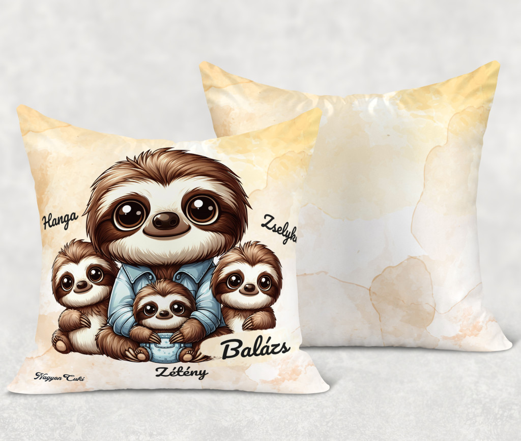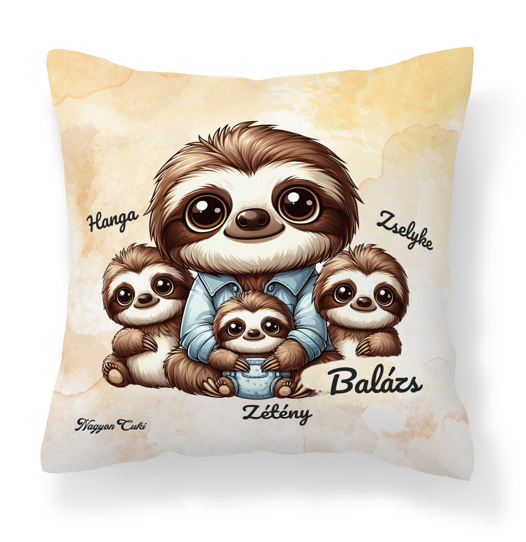 Névvel kérhető - Cuki lajhár Apa és három kis lajhár Párna | A Gondoskodás és Pihenés Ajándéka | nagyoncuki.hu