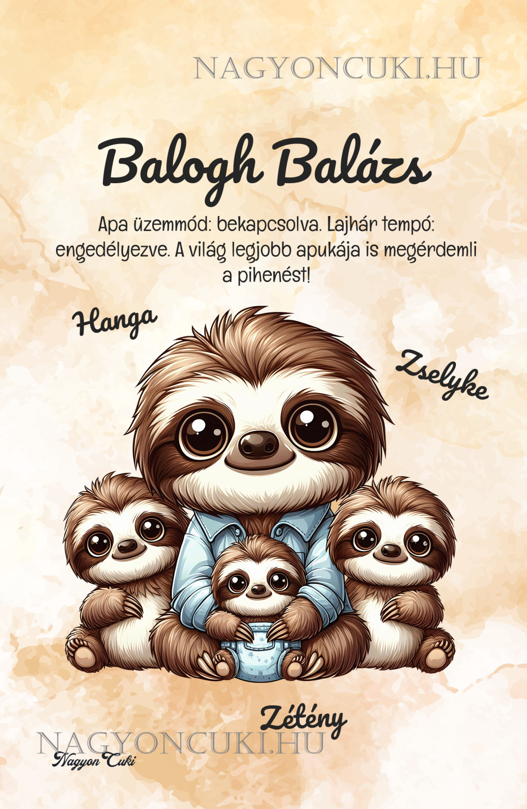 A grafikán a büszke apa lajhár látható az ölelő kicsikkel. A személyre szabható idézet (pl. "A világ legjobb Apukájának" vagy "Te vagy a mi hősünk") pedig megkoronázza az ajándékot.