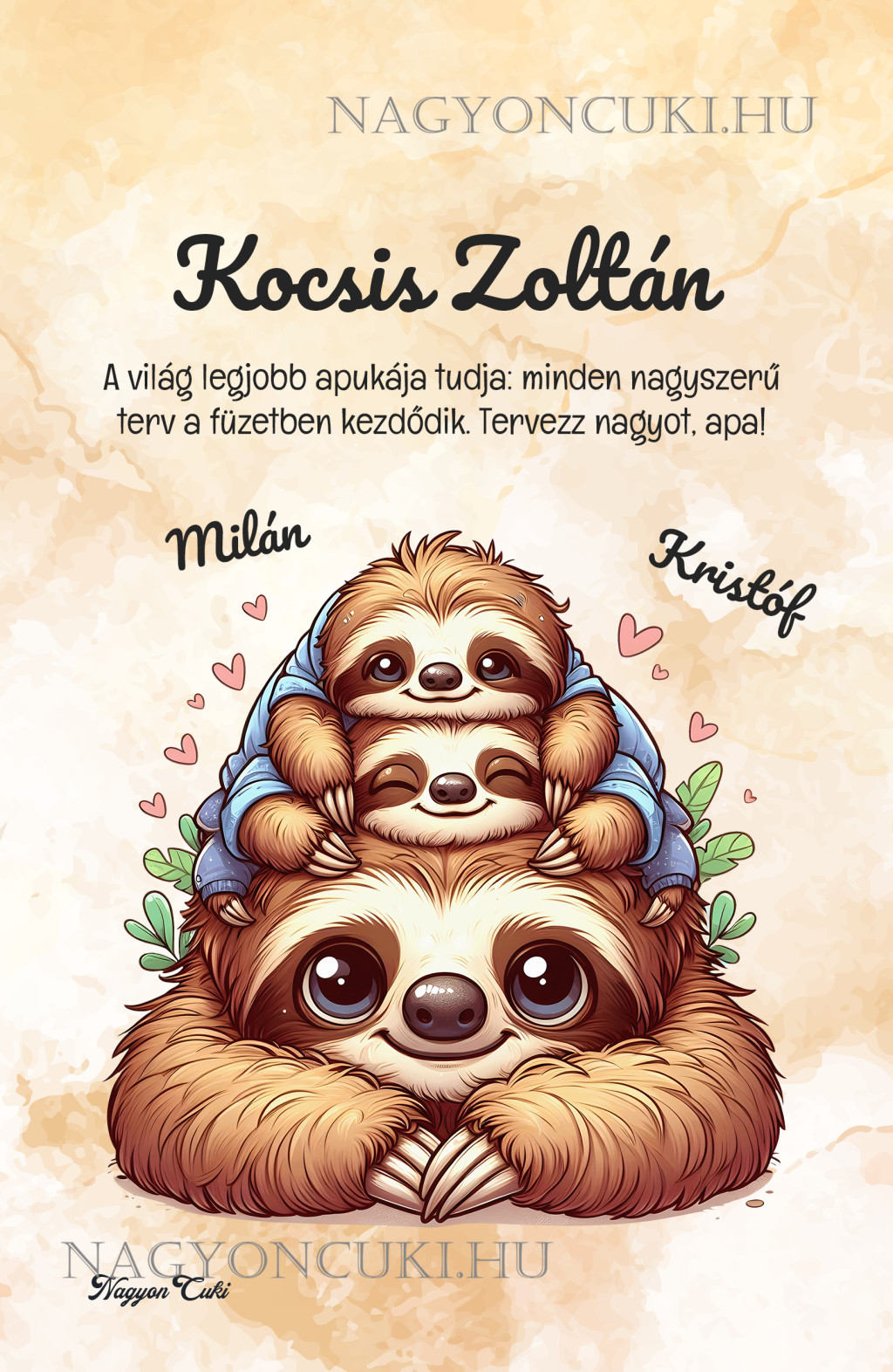 Névvel & Idézettel Kérhető Cuki lajhár Apa és két gyerek - Kicsi a rakás mintás Füzet | Névre Szóló Ajándék Apáknak & Személyes Jegyzetfüzet | nagyoncuki.hu