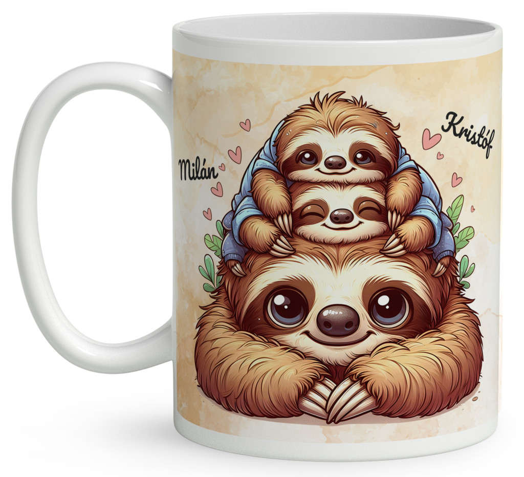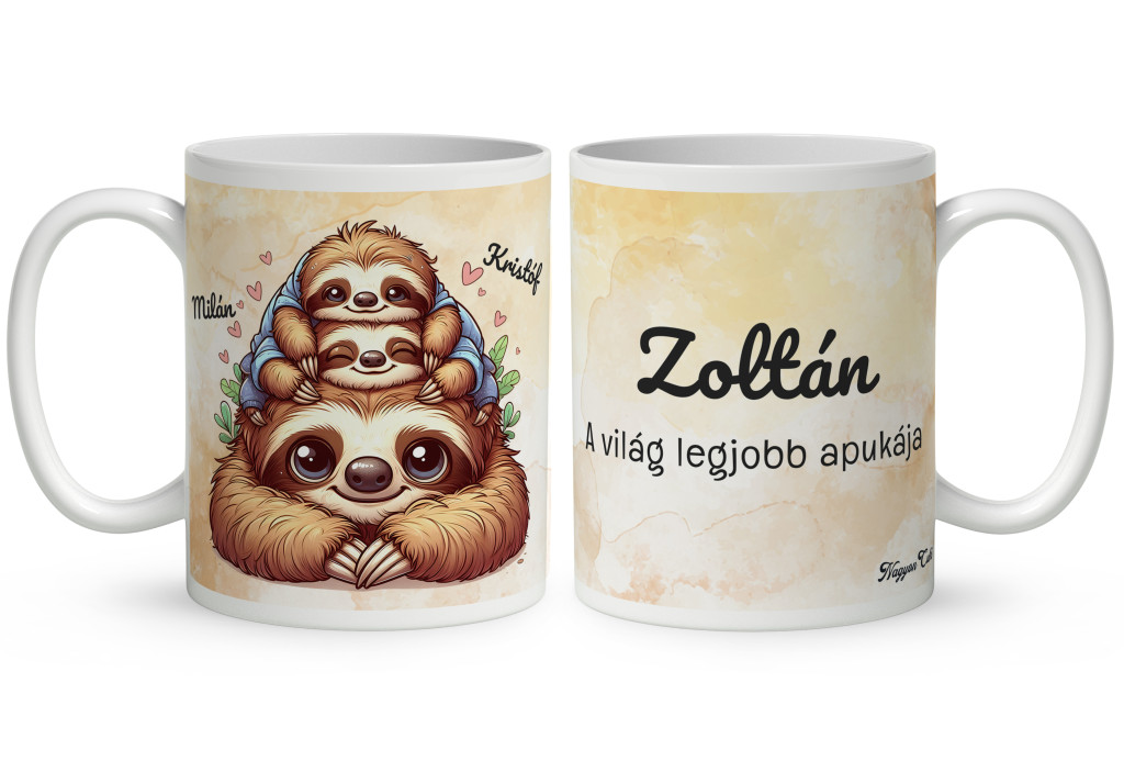 Névvel kérhető - Cuki lajhár Apa és két gyerek - Kicsi a rakás mintás Bögre | A Biztonság és Szeretet Ajándéka Apáknak | nagyoncuki.hu