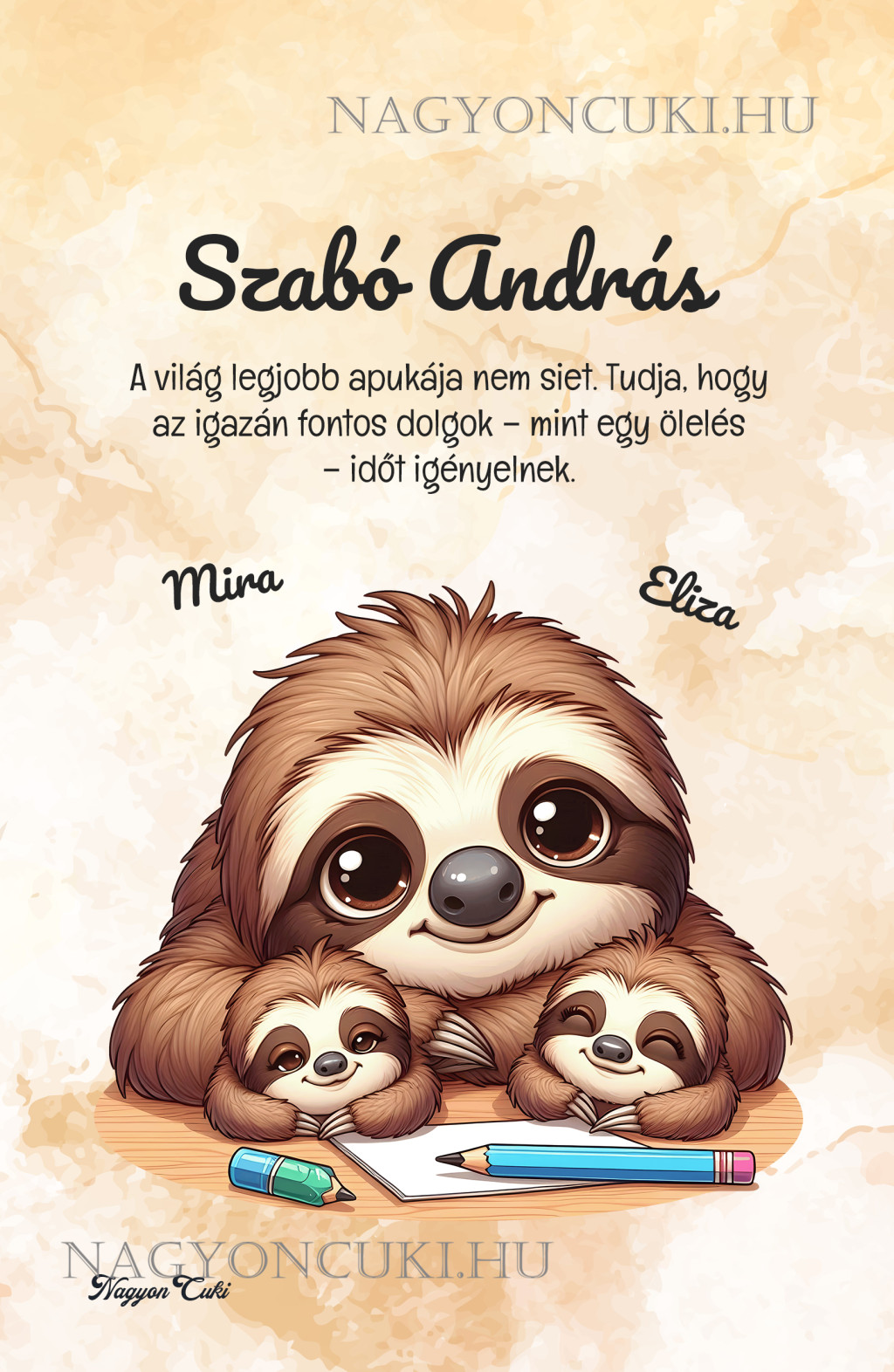 A grafikán a büszke apa lajhár látható az ölelő kicsikkel. A személyre szabható idézet (pl. "A világ legjobb Apukájának" vagy "Te vagy a mi hősünk") pedig megkoronázza az ajándékot.