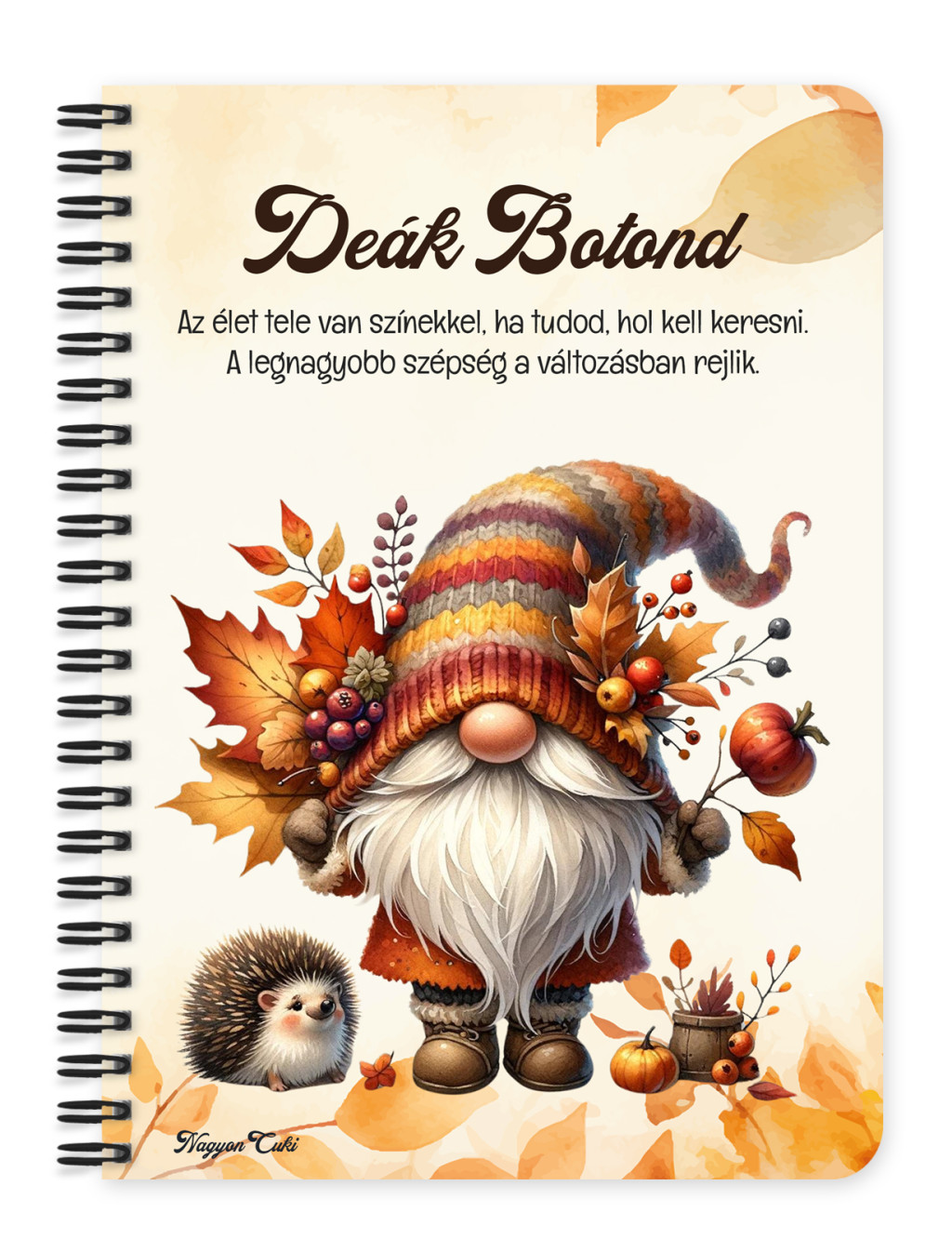 Képzeld el azt a mosolyt a megajándékozott arcán, amikor egy olyan füzetet tart a kezében, ami a legféltettebb gondolatait, álmait vagy fontos jegyzeteit őrzi. Ez a különleges, személyre szabható, egyedi tervezésű őszi manó mintás füzet a könnyed elegancia, a játékos cukiság és a nyugodt, elmélyült pillanatok bájos megtestesítője. Egy apró, szeretetteljes gesztus, amely a mindennapokat is fénnyel tölti meg, és minden lapon új ötletekre sarkall. Kiváló ajándék ötlet nőknek és mindenkinek, aki értékeli a személyes és lélekemelő meglepetéseket.