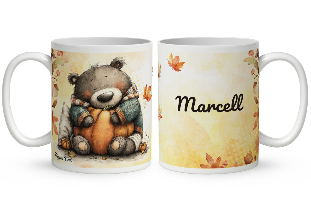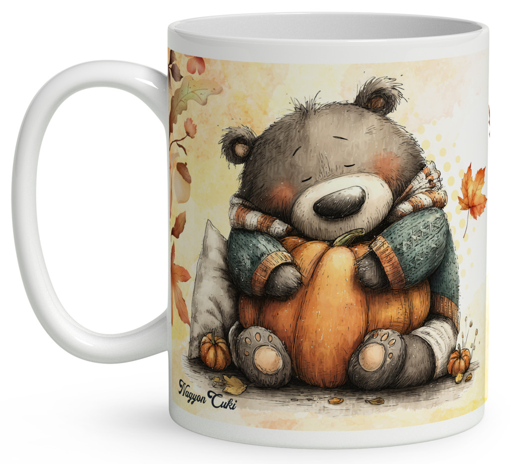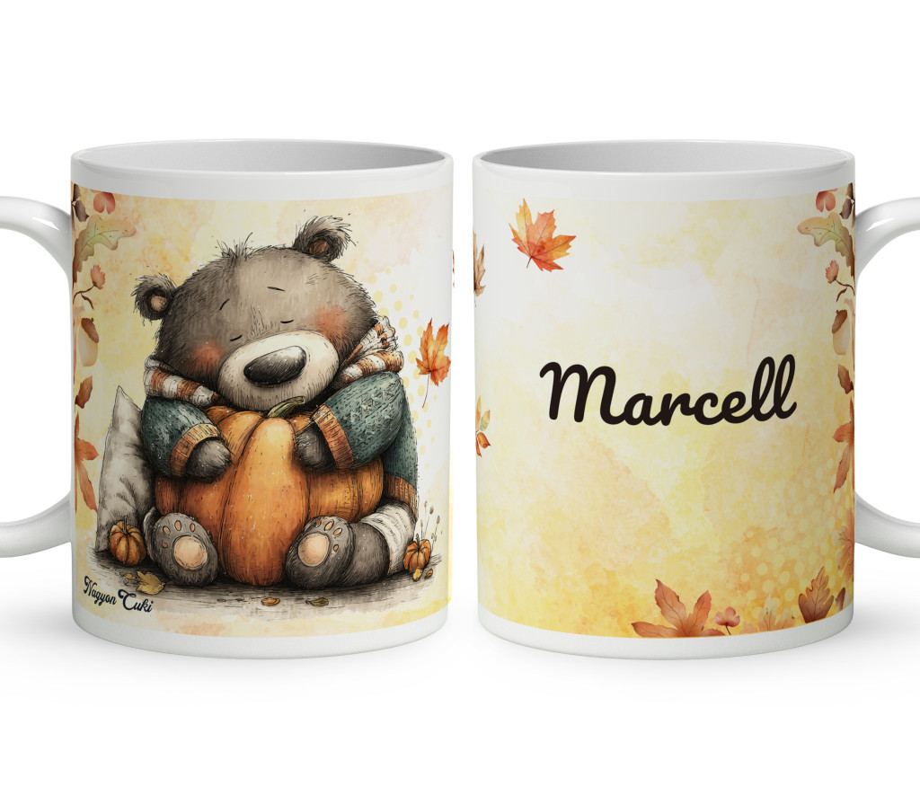 Névvel kérhető - Cuki őszi szundi maci és a tök Bögre mintás Bögre | Egyedi Ajándék Maci Rajongóknak | nagyoncuki.hu