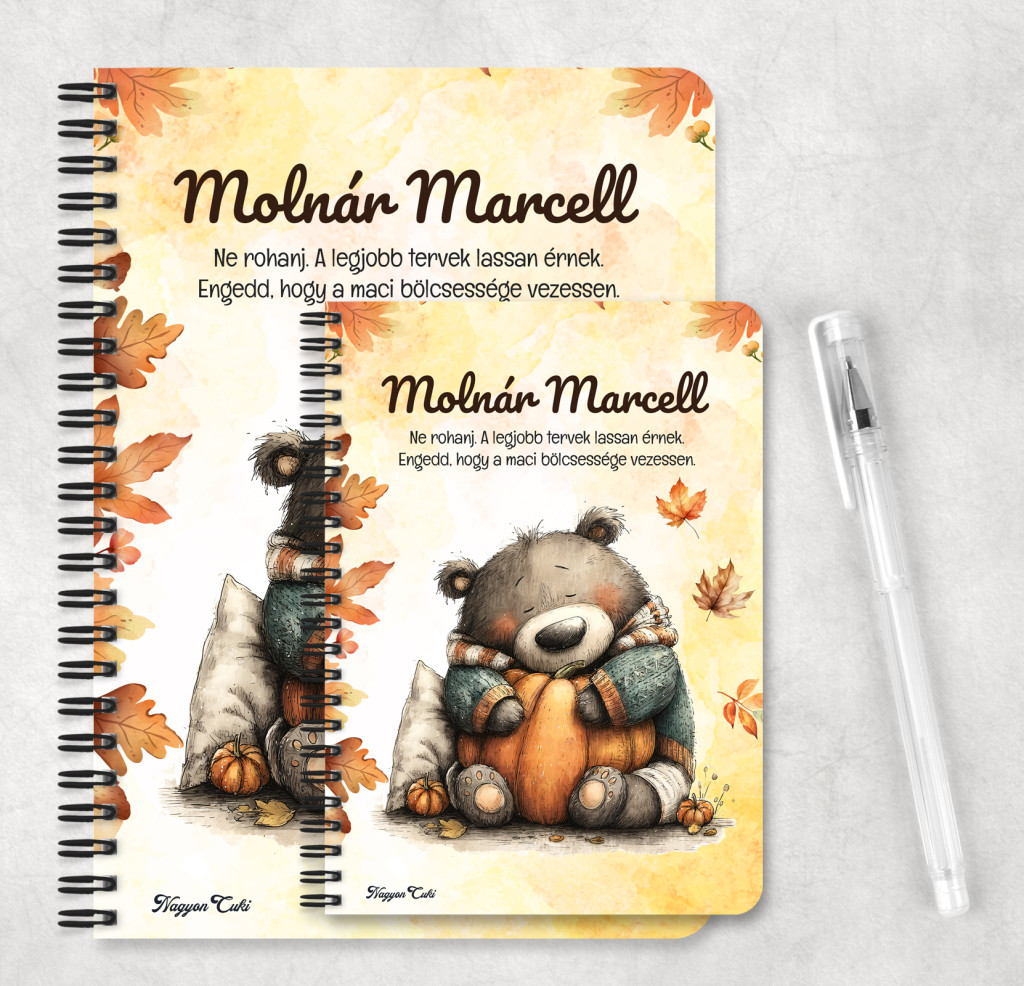 Képzeld el azt a mosolyt és a békés hangulatot, amikor egy olyan füzetet tartasz a kezedben, amely nemcsak a teendőid és jegyzeteid rendszerezésére szolgál, hanem a macik szerethető báját, az őszi meghittséget és a pihenés örömét is tükrözi! Ez a különleges, névre szóló, egyedi tervezésű őszi maci füzet a kényelmes bekuckózás, a kreativitás és az Erdei Varázs kollekció elragadó megtestesítője. Egy apró, szeretetteljes gesztus, amely a tanulást, a munkát és a jegyzetelést is fénnyel tölti meg, inspirációt adva minden sorhoz. Kiváló ajándék ötlet mindenkinek – legyen szó nőről, férfiról, vagy diákról – aki értékeli a személyes és lélekemelő meglepetéseket!