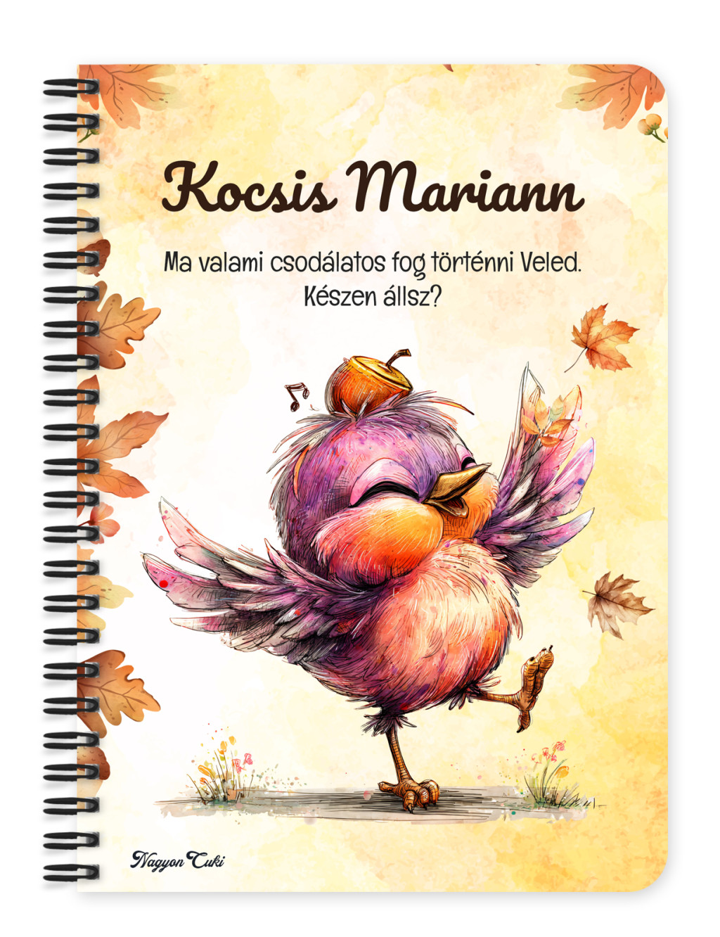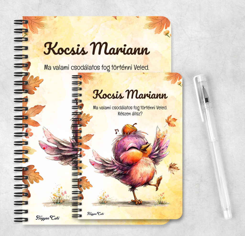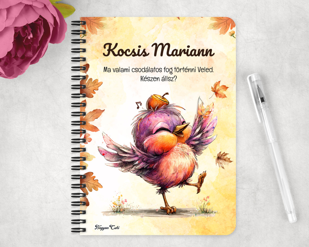 Névvel & Idézettel Kérhető Cuki őszi táncoló kismadár mintás Füzet | Névre Szóló Ajándék & Személyes Madaras Jegyzetfüzet | nagyoncuki.hu