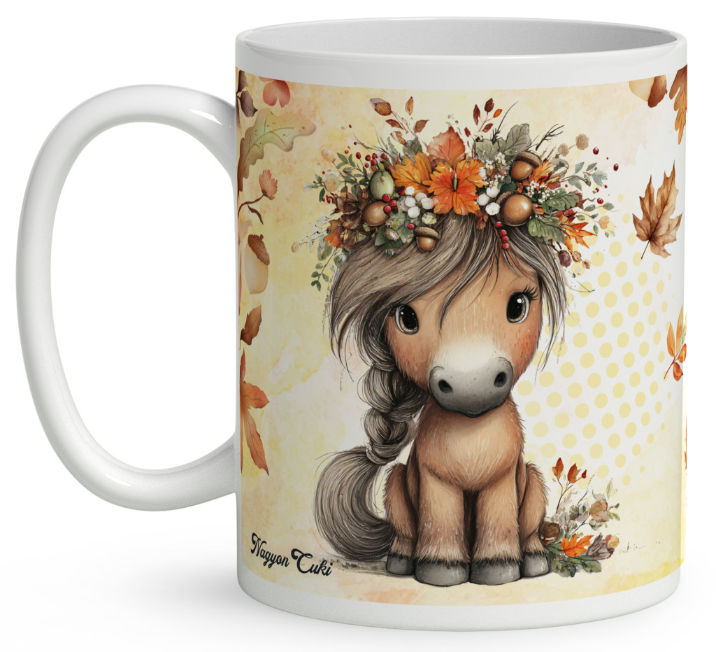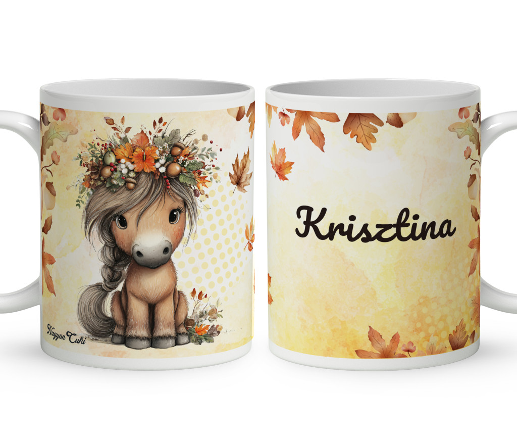 Névvel kérhető - Cuki őszi virágkoszorús póni mintás bögre | Ajándék ötlet Lovas rajongóknak | nagyoncuki.hu