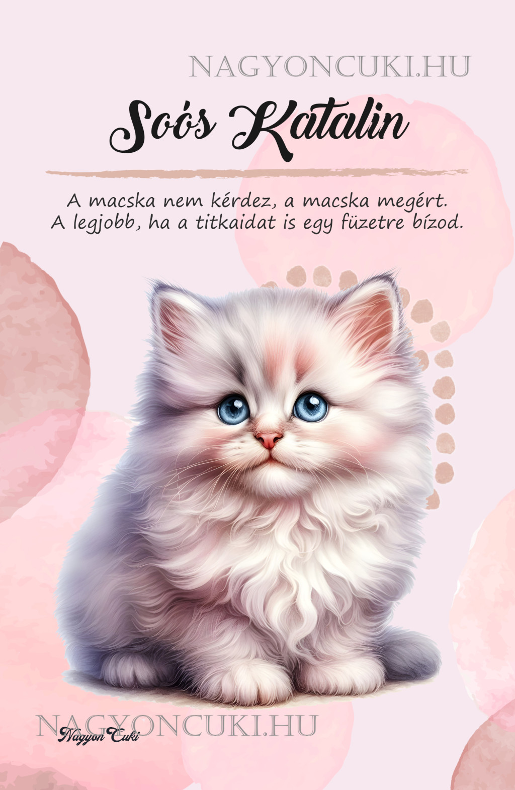 Ha elvarázsolt ez a tündéri dizájn, és tetszenek a személyre szabható ajándék ötleteink, nézd meg a többi aranyos kiscicát is a Cuki cicák a nagyoncuki.hu-n! Fedezz fel még több egyedi ajándékot állatbarátoknak és más, vidám témájú csodát!