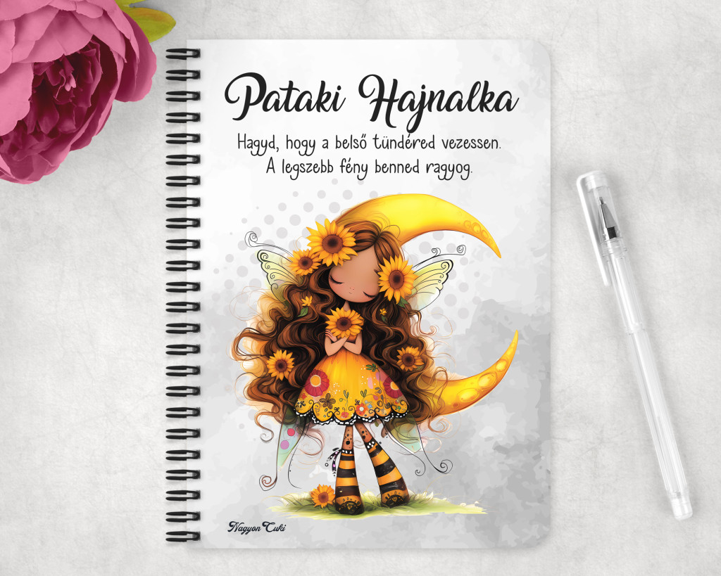 Névvel Kérhető - Hosszúhajú cuki Napraforgós tündérlány és a Hold Füzet | Egyedi Ajándék Nőknek & Személyes Tündéres Napló | nagyoncuki.hu