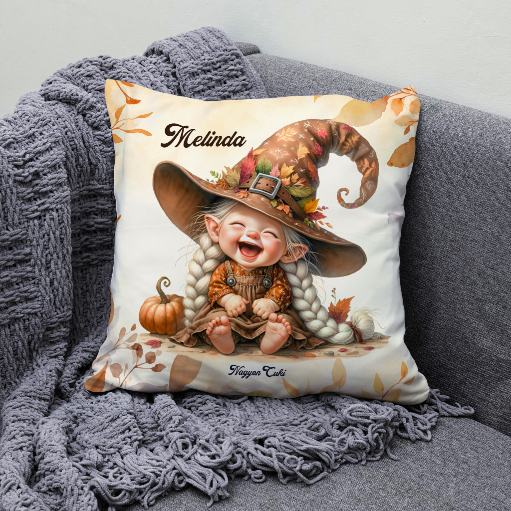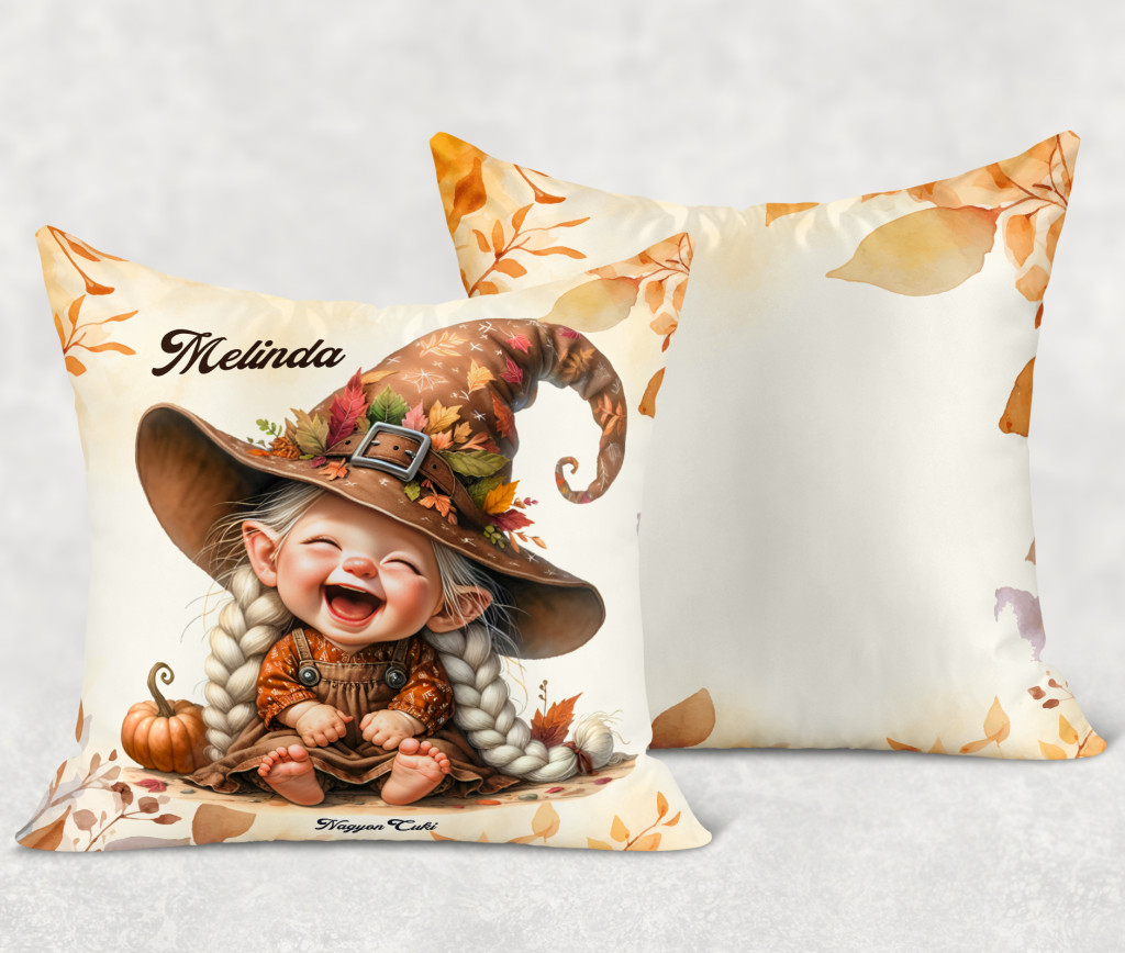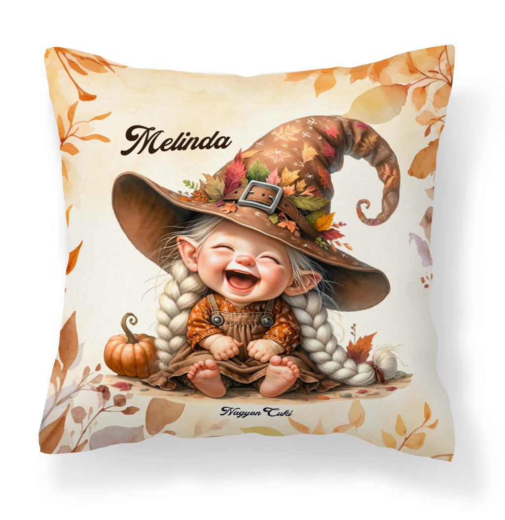 Névvel kérhető - Kacagó őszi manó lány mintás különleges és egyedi párna | A tökéletes őszi ajándék nőknek és kislányoknak | nagyoncuki.hu