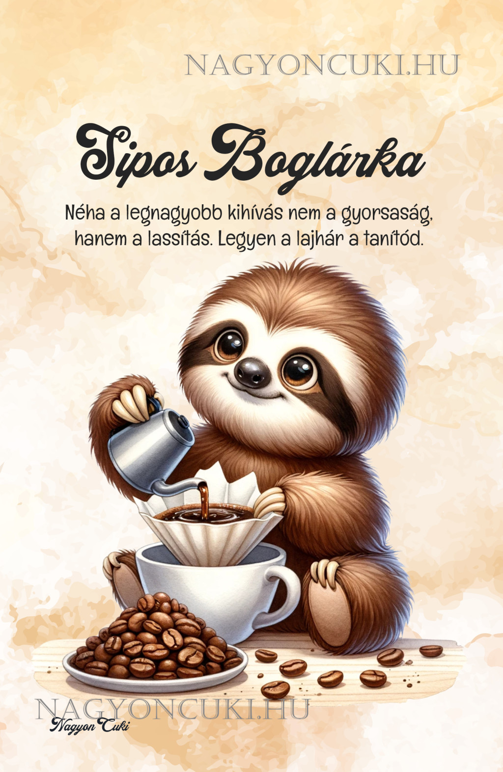 Ez a kávéimádó lajhár a "slow living", a tudatos lelassulás és a "majd ráérek" pillanatok aranyos nagykövete. Azt üzeni, hogy nem kell rohanni sehova, de egy jó kávé még a lassú mozgáshoz is ad egy kis extra, kellemes löketet. Tökéletes társ a gondolatok lassú, megfontolt lejegyzéséhez, a naplóíráshoz vagy a teendők ráérős megtervezéséhez.