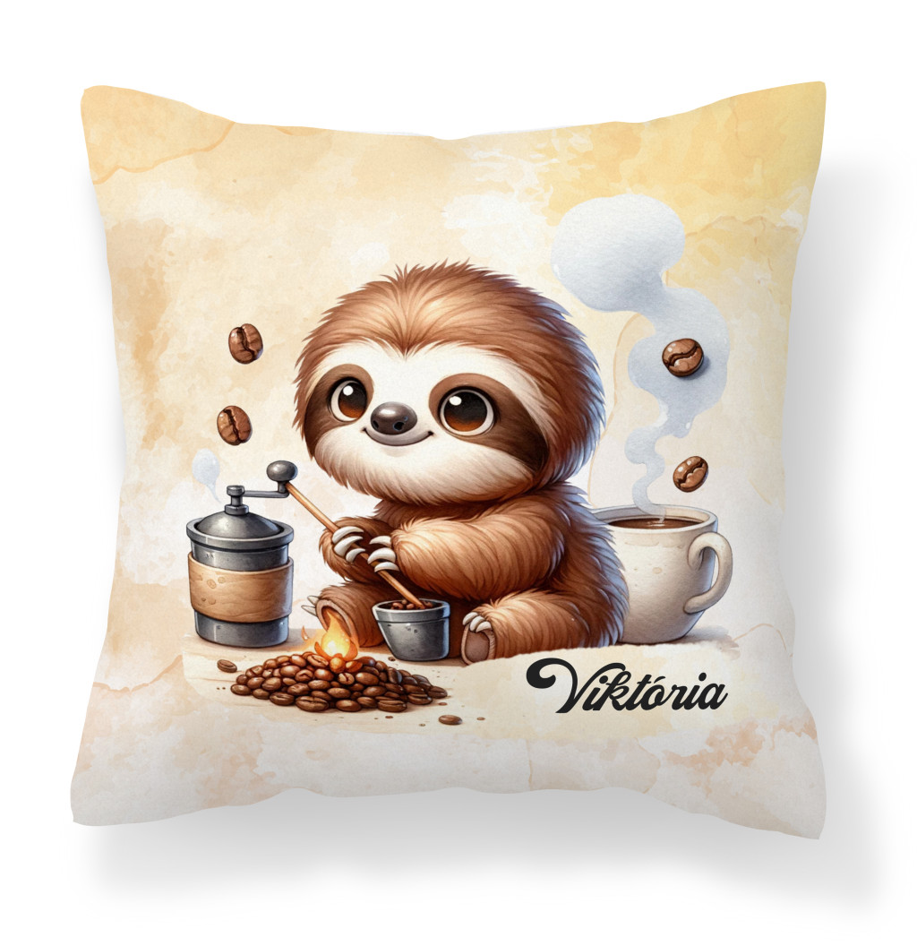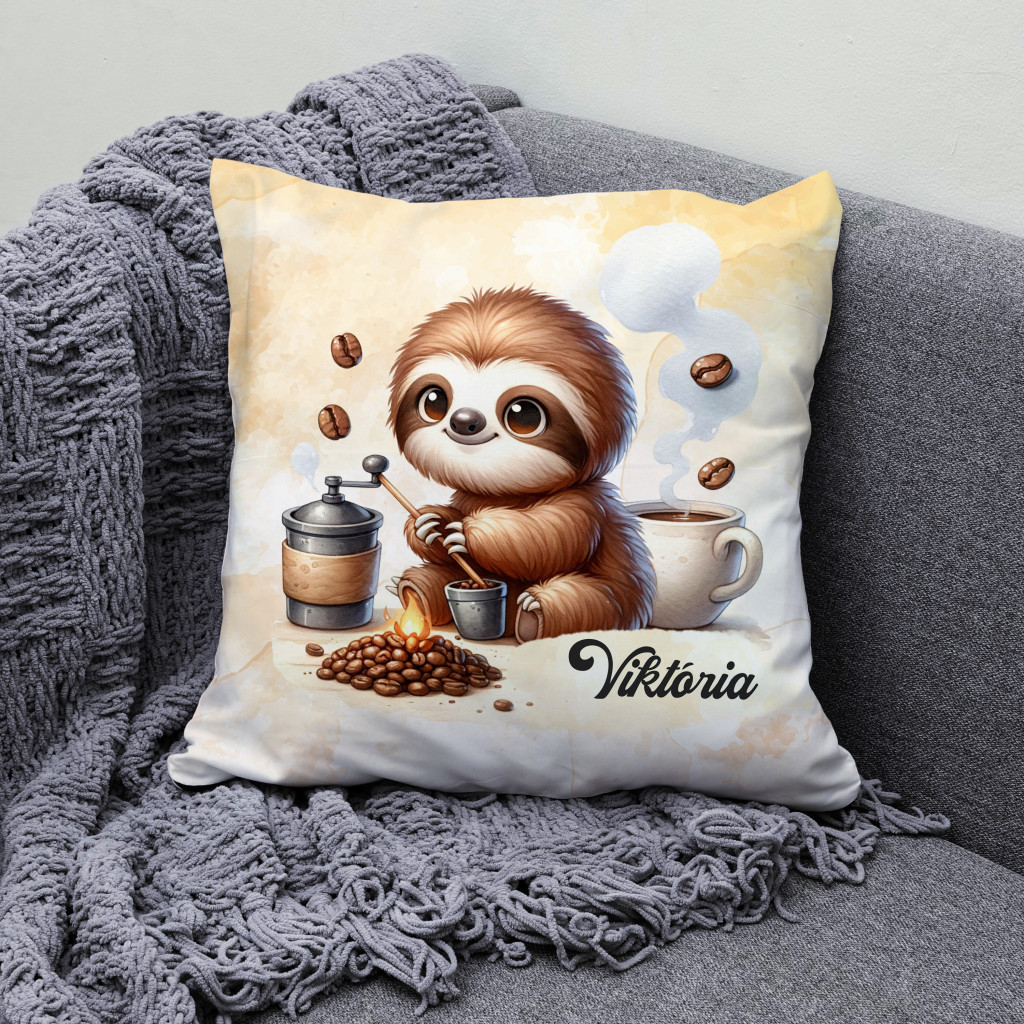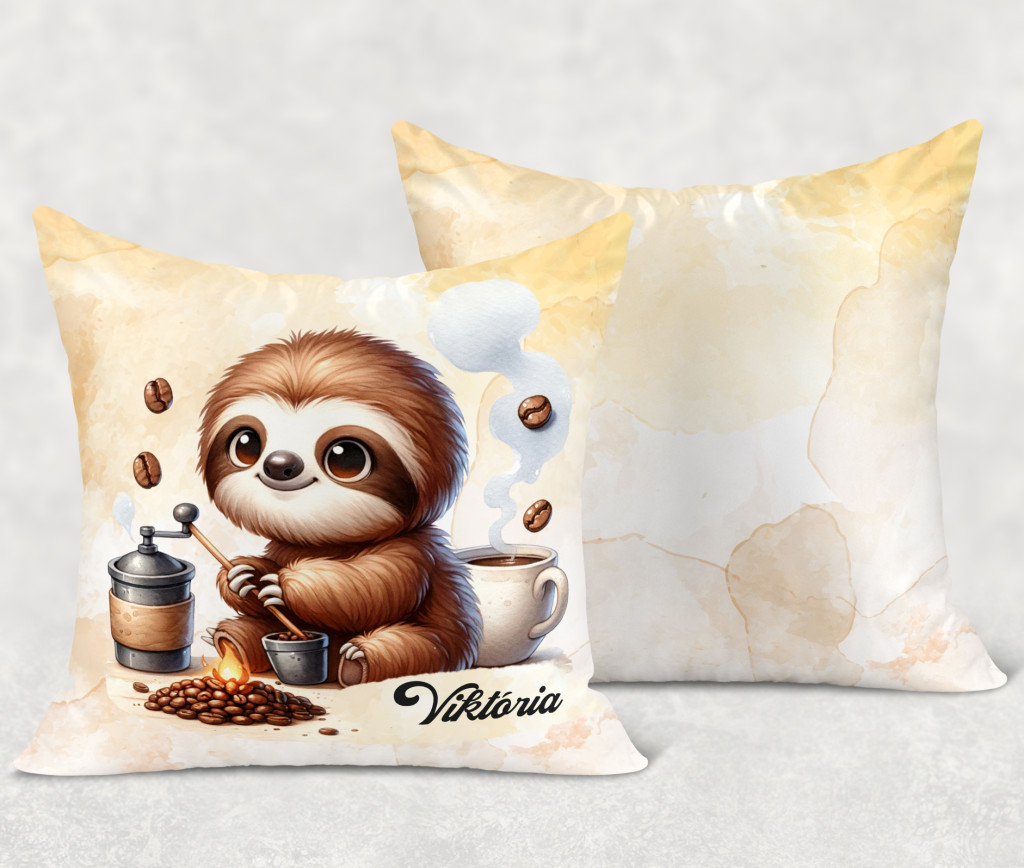 Névvel kérhető - Kávés lajhár és frissen pörkölt kávé mintás különleges és egyedi párna| A tökéletes ajándék Lajhár Rajongóknak | nagyoncuki.hu
