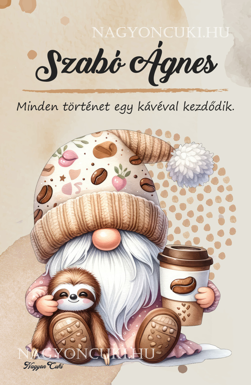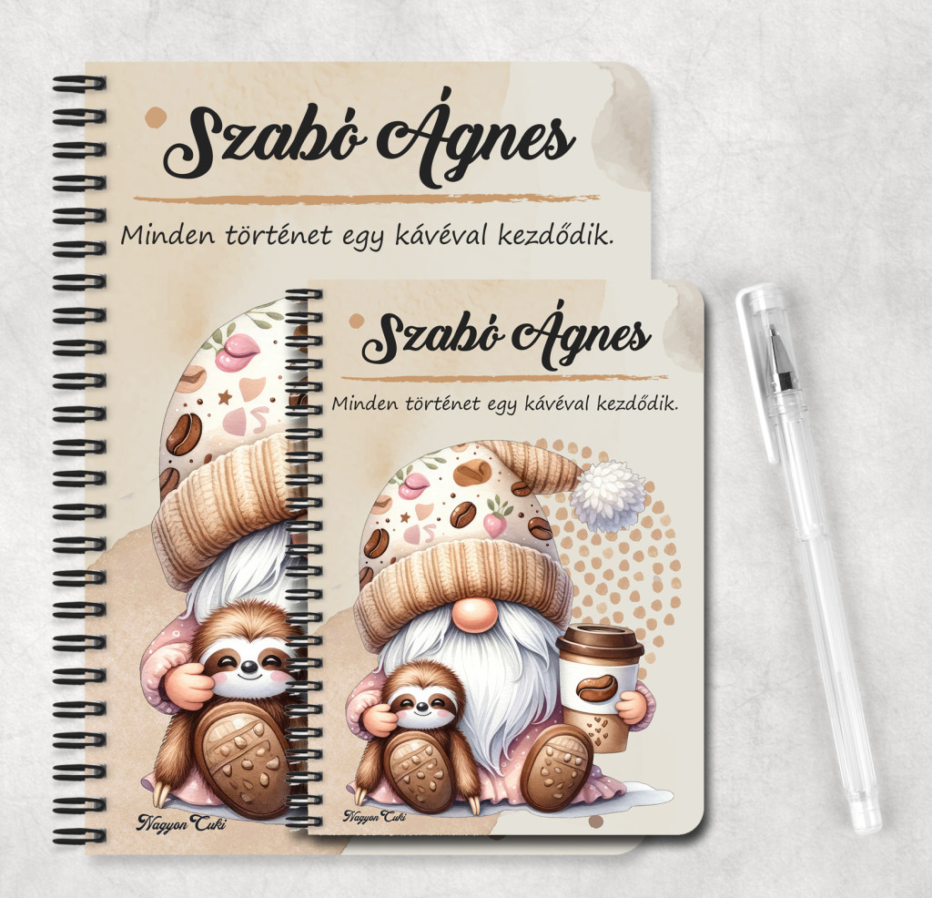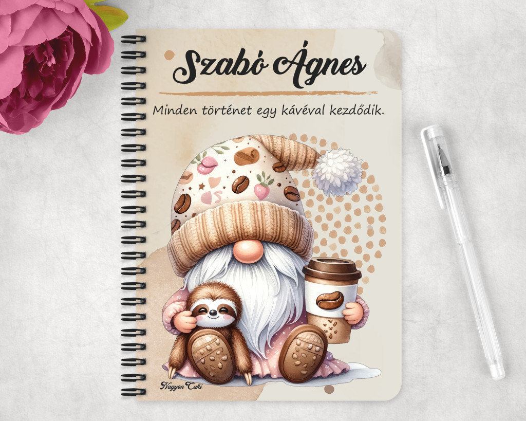 Névvel & Idézettel Kérhető - Kávés manó cuki lajhárral Mintás Füzet | Egyedi Ajándék Kávéimádóknak & Személyre Szabható Manós Füzet | nagyoncuki.hu