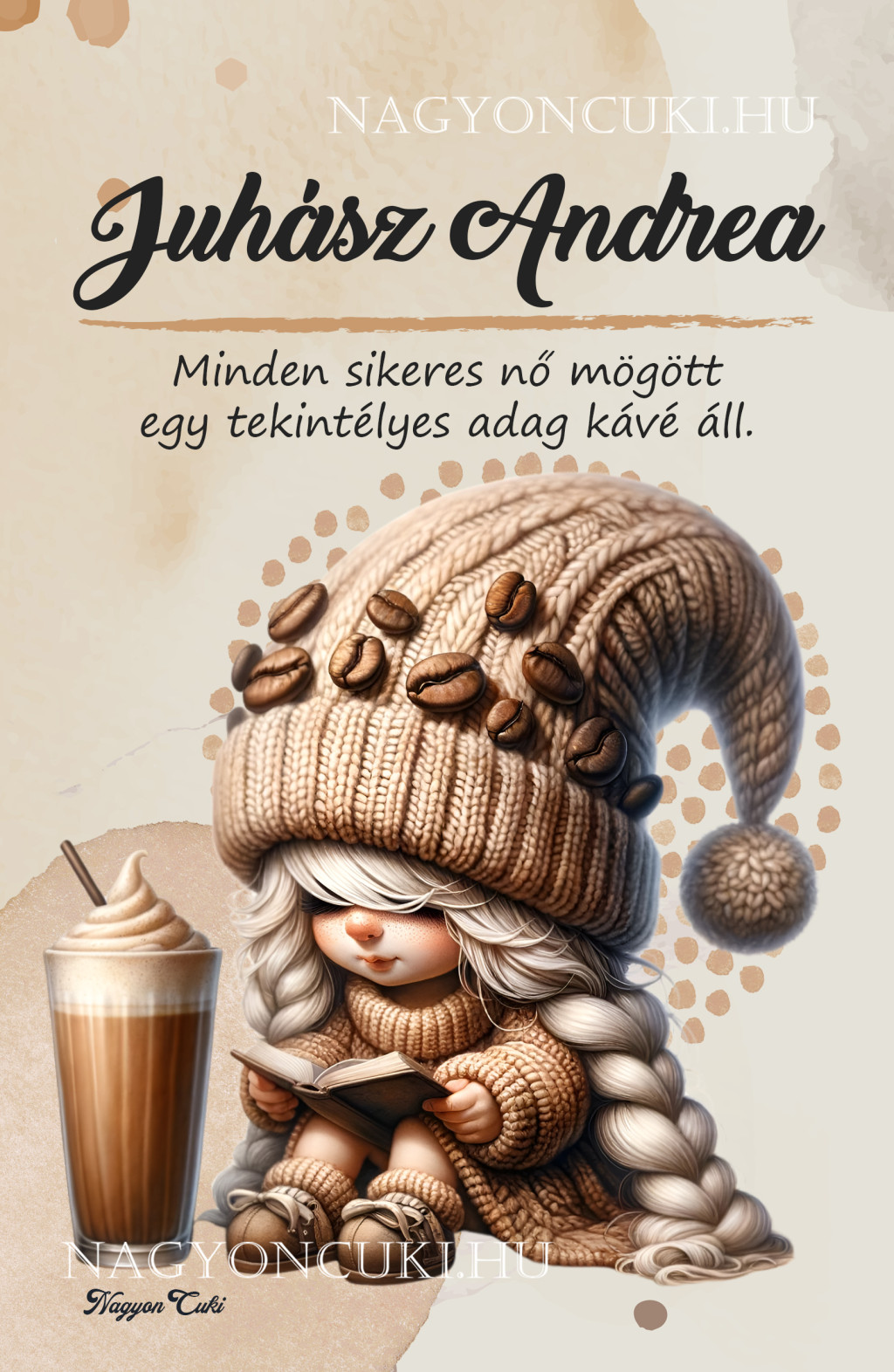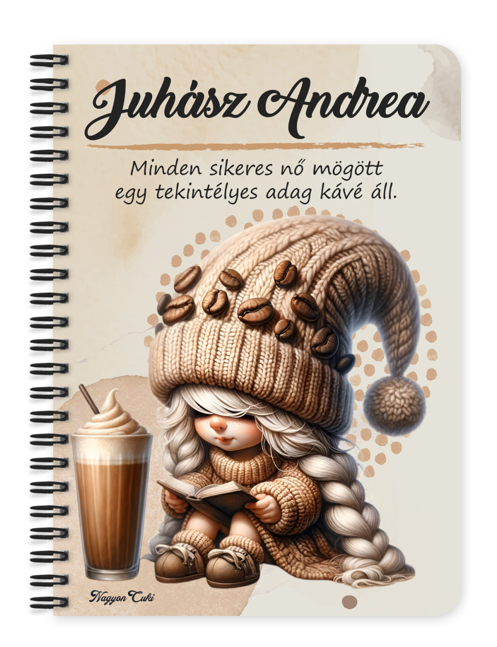 Névvel & Idézettel Kérhető kávés manó lány - Kávé és könyv Mintás Füzet | Egyedi Ajándék Kávéimádóknak & Személyre Szabható Manós Füzet | nagyoncuki.hu