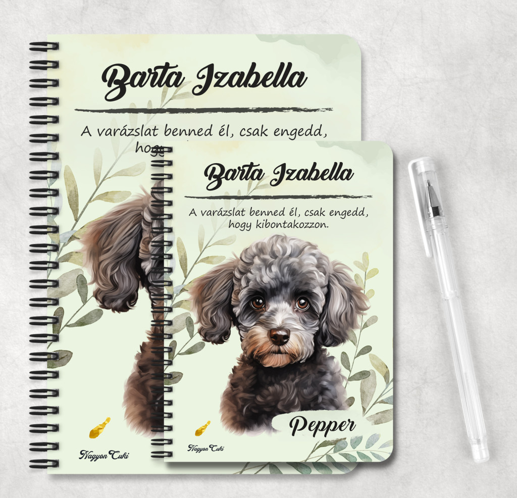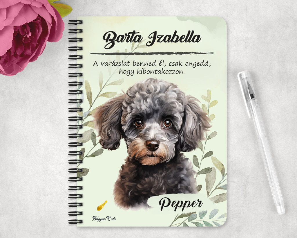 Rendeld meg most ezt a teljesen személyre szabható, egyedi kutyás füzetet, és hordozd magadnál büszkén a négylábú barátod portréját.