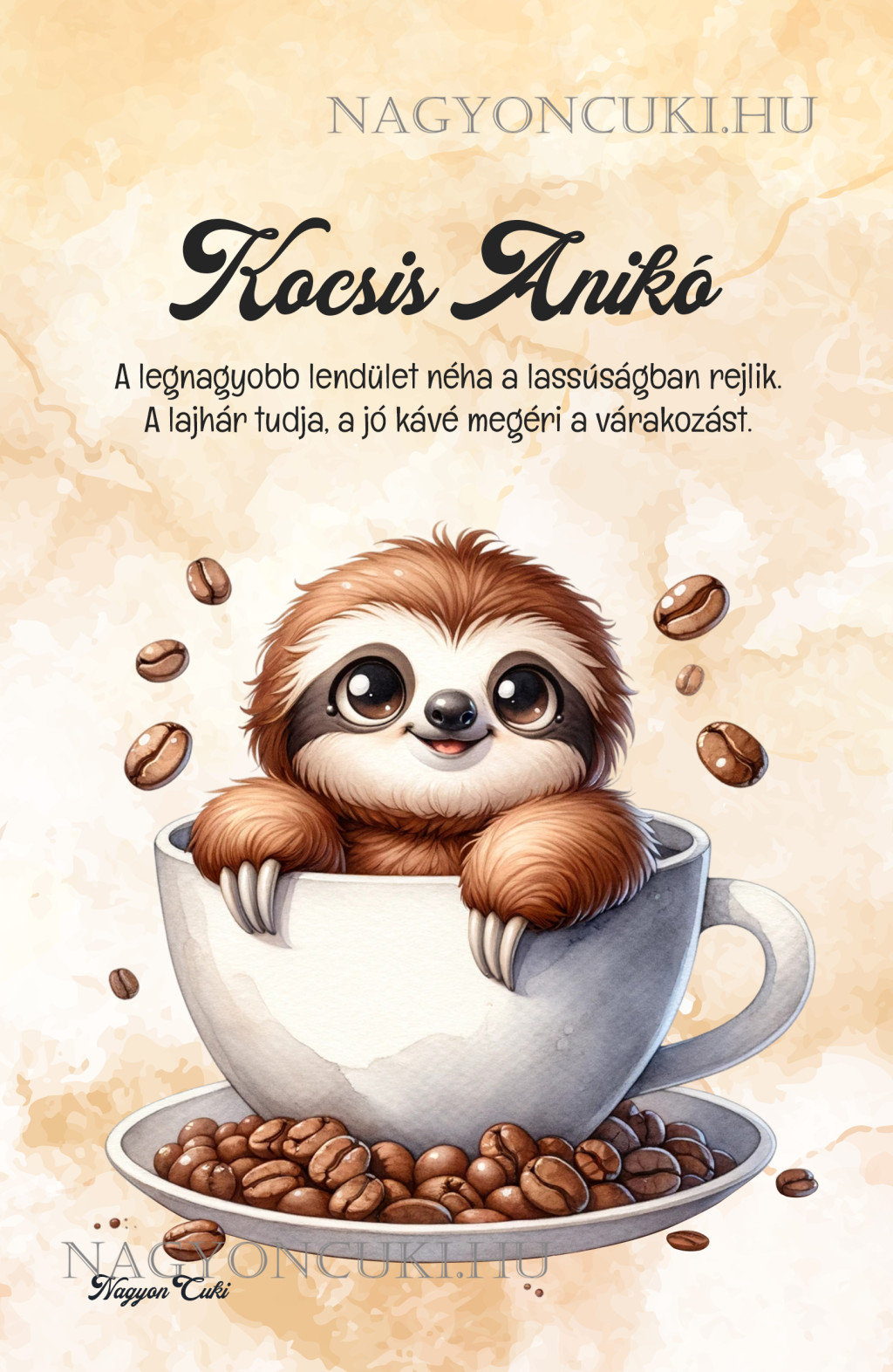 Ez a kávéimádó lajhár a "slow living", a tudatos lelassulás és a "majd ráérek" pillanatok aranyos nagykövete. Azt üzeni, hogy nem kell rohanni sehova, de egy jó kávé még a lassú mozgáshoz is ad egy kis extra, kellemes löketet. Tökéletes társ a gondolatok lassú, megfontolt lejegyzéséhez, a naplóíráshoz vagy a teendők ráérős megtervezéséhez.