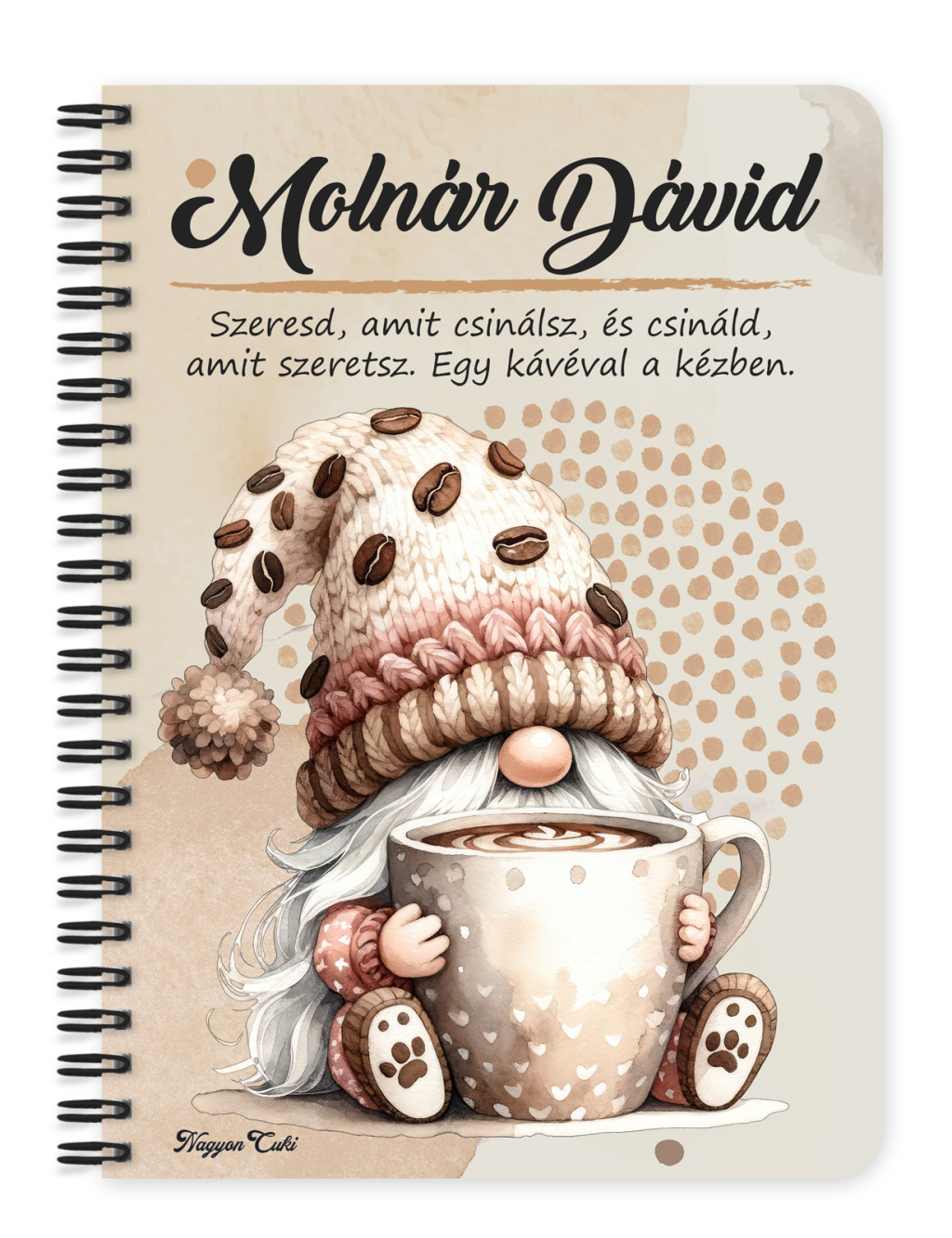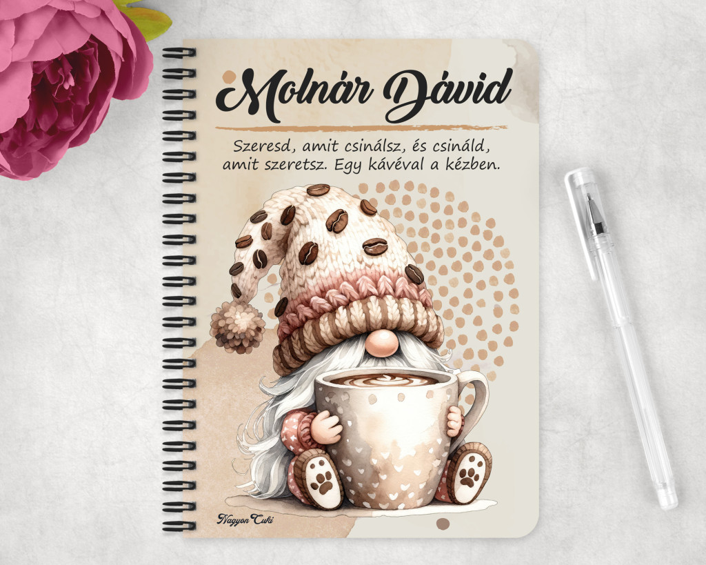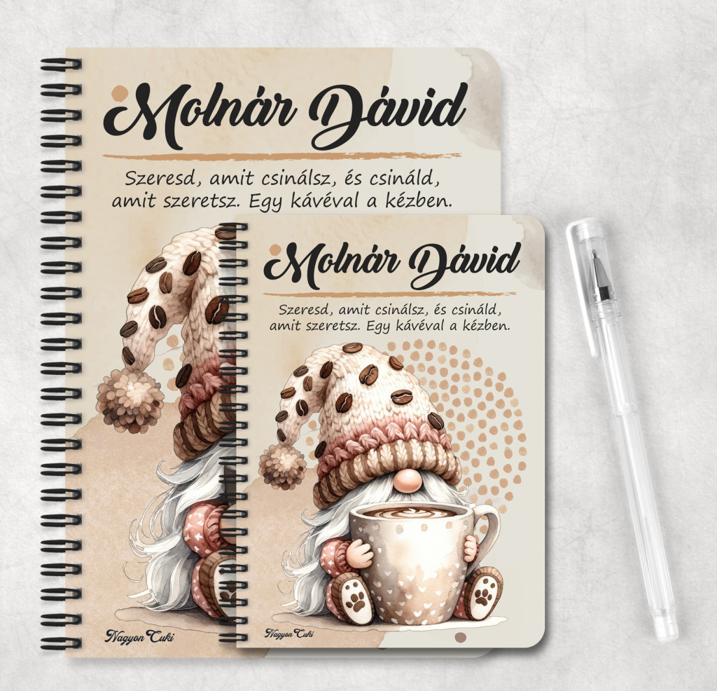 Névvel & Idézettel Kérhető - Nagy bögrés kávés manó Mintás Füzet | Egyedi Ajándék Kávéimádóknak & Személyre Szabható Manós Füzet | nagyoncuki.hu