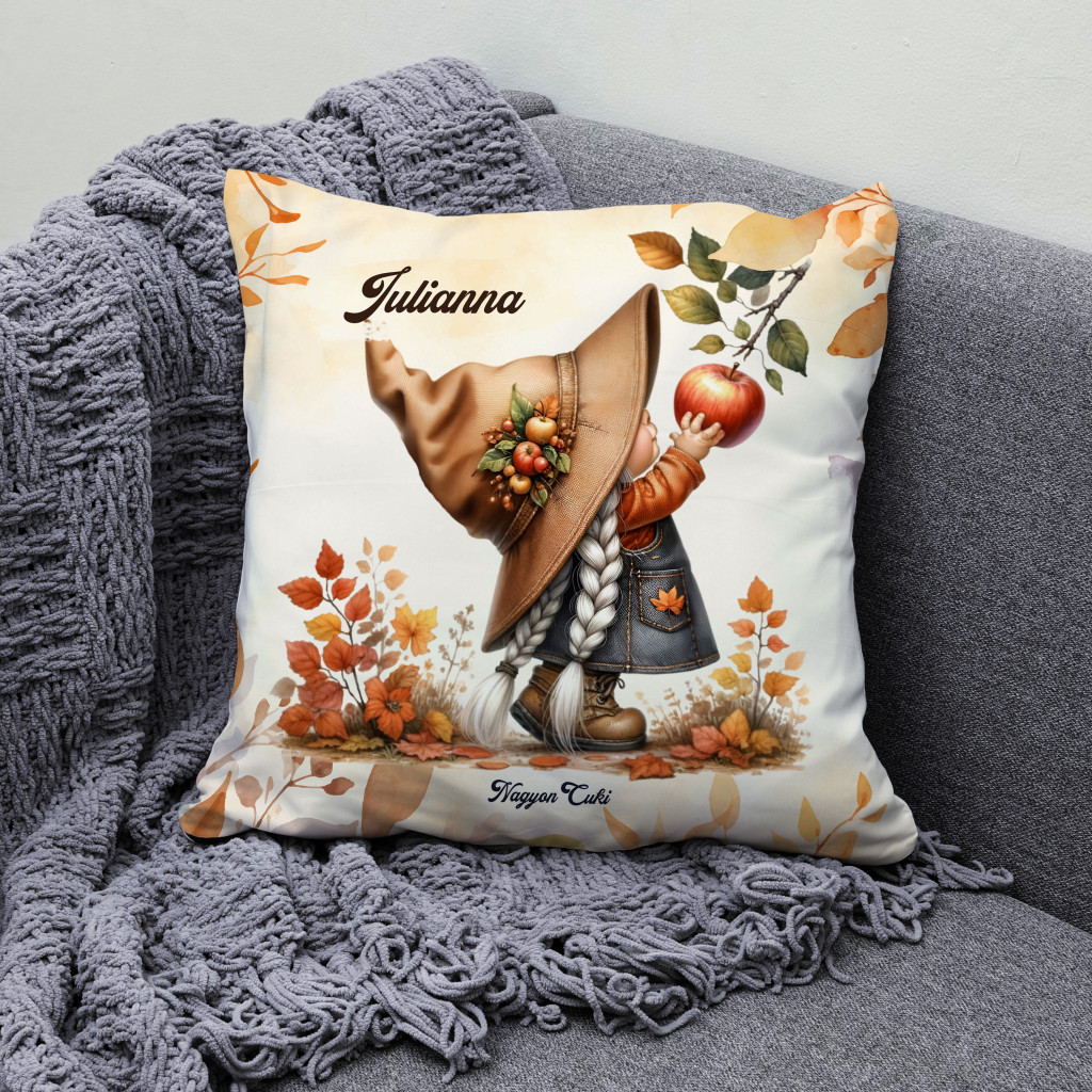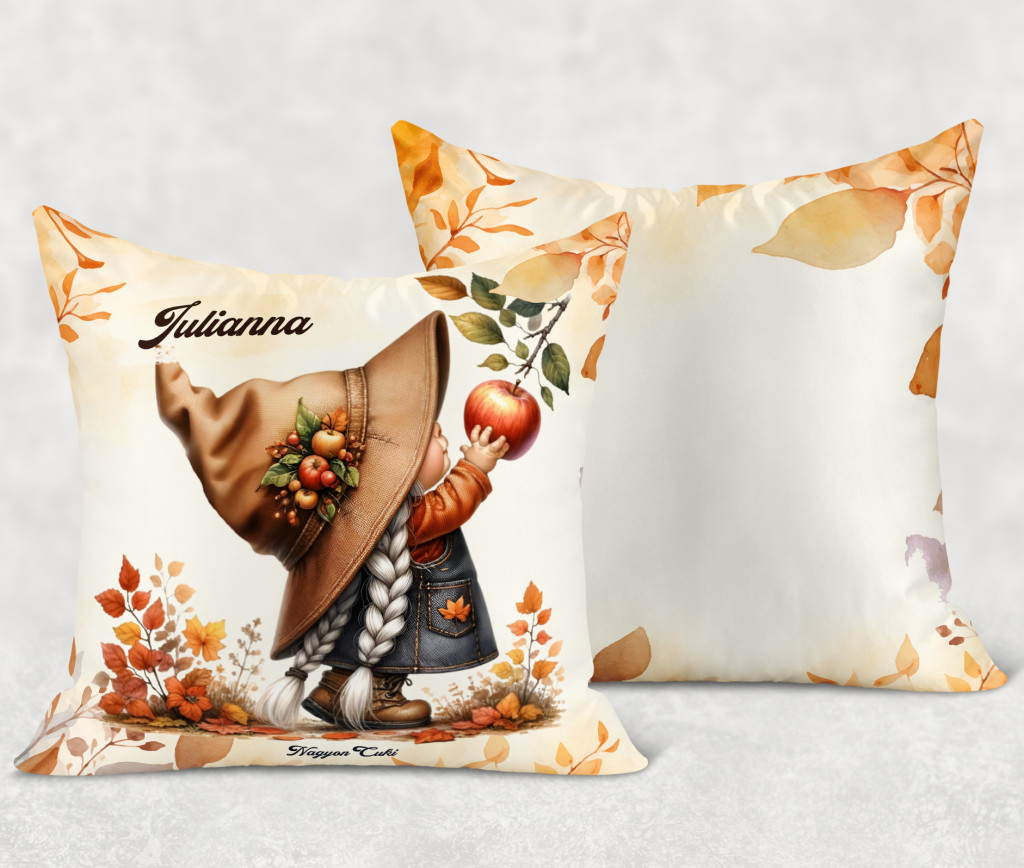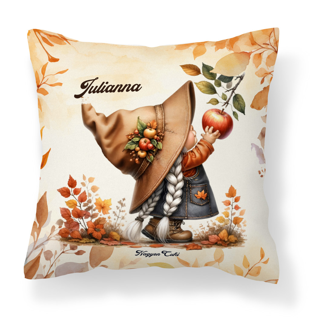 Névvel kérhető - Őszi manó lány és az alma mintás különleges és egyedi párna | A tökéletes őszi ajándék nőknek és kislányoknak | nagyoncuki.hu
