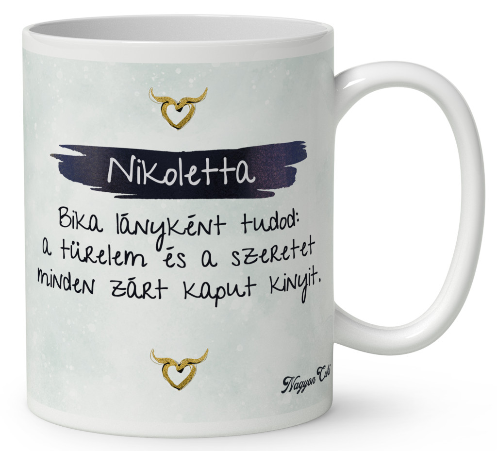 Ezt a harmonikus, stílusos és „csili-vili” életérzést zártuk ebbe a Csini Bika lányos bögrébe. Ez nem egy egyszerű ajándéktárgy. Ez egy elismerő mosoly a reggeli kávé mellé. Amikor a tulajdonosa a kezébe veszi ezt a bögrét, és meglátja rajta a saját karakterét, a saját nevét vagy a kedvenc idézetét, tudni fogja:"Különleges vagyok, és valaki pontosan ilyennek szeret engem.".