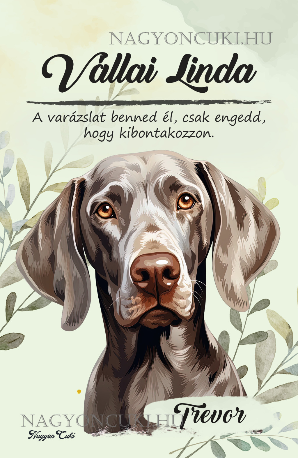 - Stílusos Fajtaspecifikus Dizájn: A grafika szeretettel és a részletekre való odafigyeléssel készült, hogy megragadja a Weimari vizsla fajta imádnivaló vonásait.
